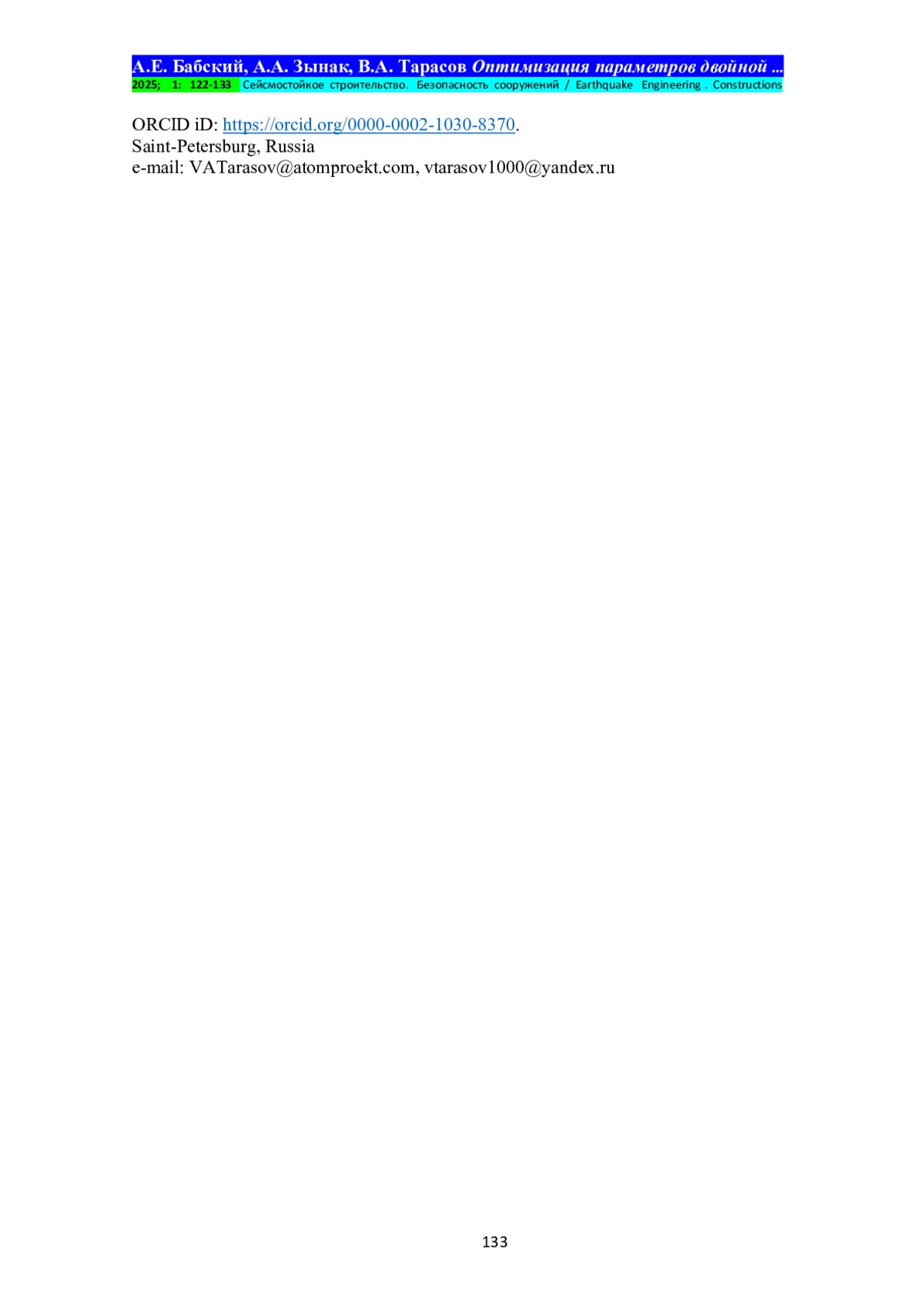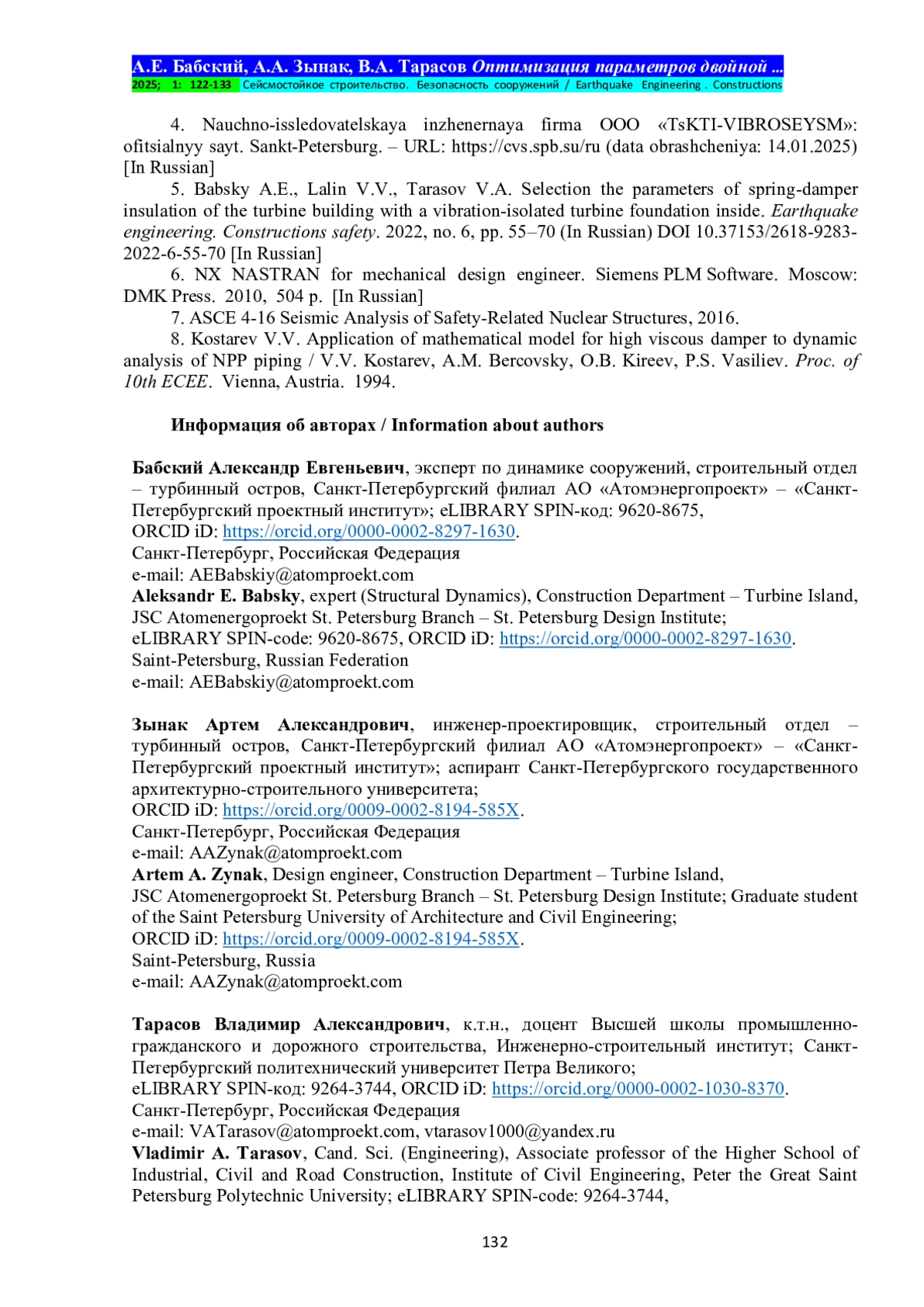2. Бабский А.Е. Тарасов В.А. Сейсмостойкость виброизолированных фундаментов турбоагрегатов // Сейсмостойкое строительство. Безопасность сооружений. 2021. № 5. С. 3-49.