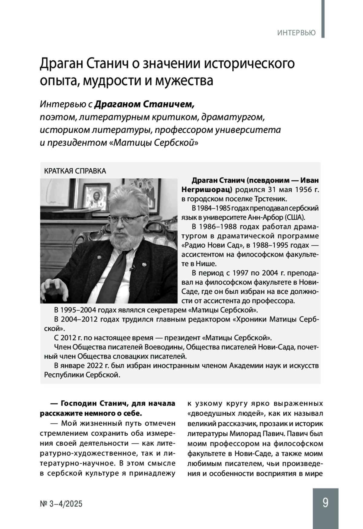 Интервью с Драганом Станичем, поэтом, литературным критиком, драматургом, историком литературы, профессором университета и президентом «Матицы Сербской»