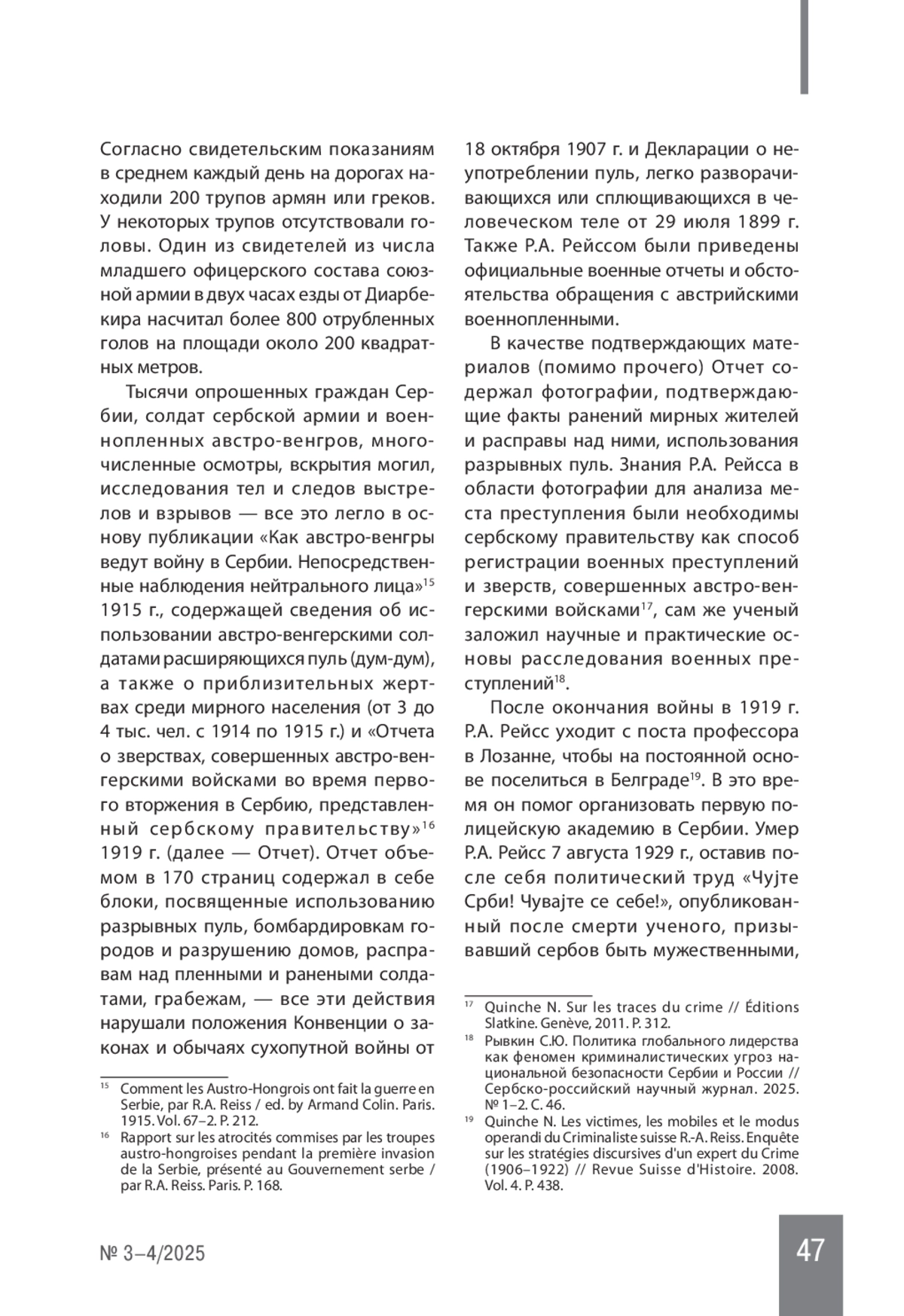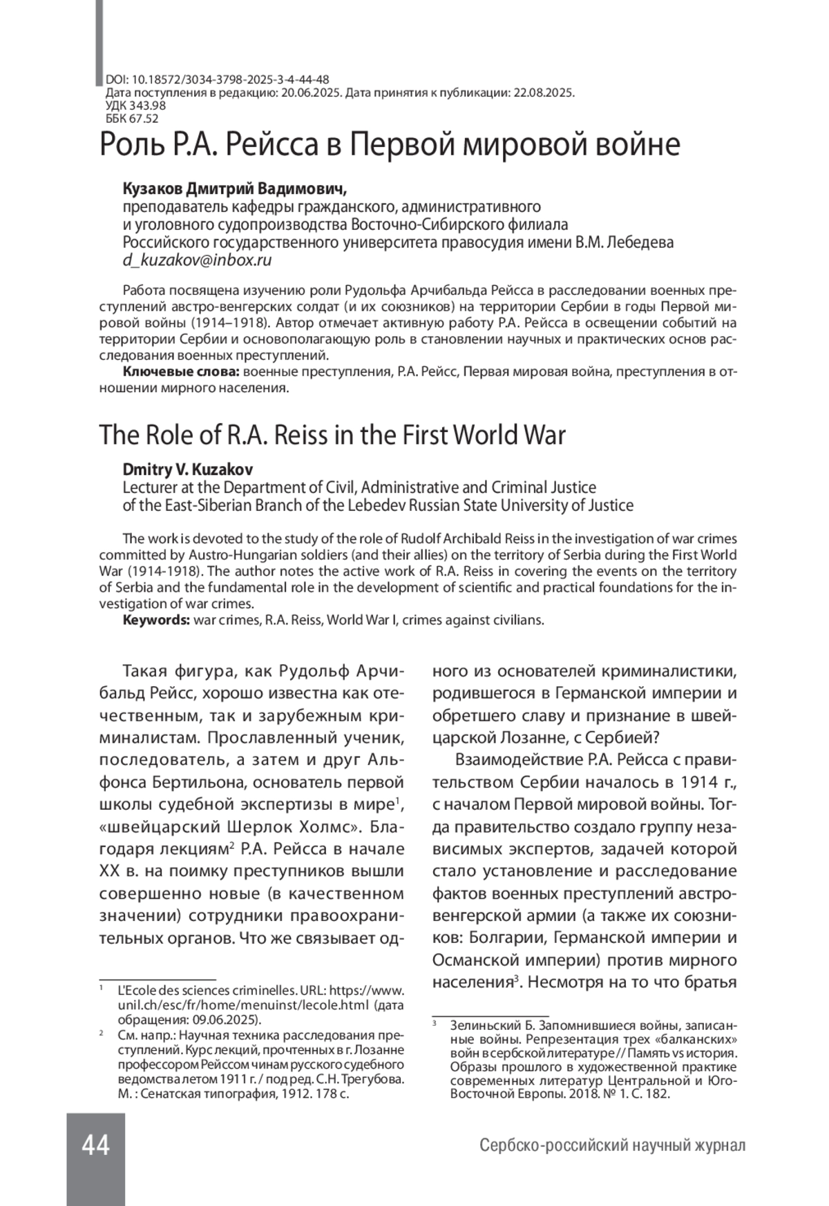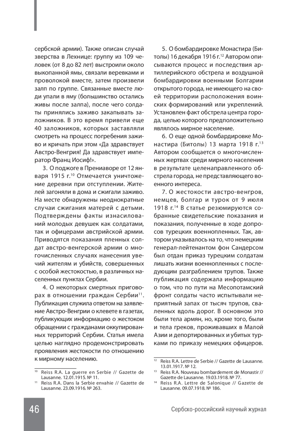 Работа посвящена изучению роли Рудольфа Арчибальда Рейсса в расследовании военных преступлений австро-венгерских солдат (и их союзников) на территории Сербии в годы Первой мировой войны (1914–1918). Автор отмечает активную работу Р. А. Рейсса в освещении событий на территории Сербии и основополагающую роль в становлении научных и практических основ расследования военных преступлений.