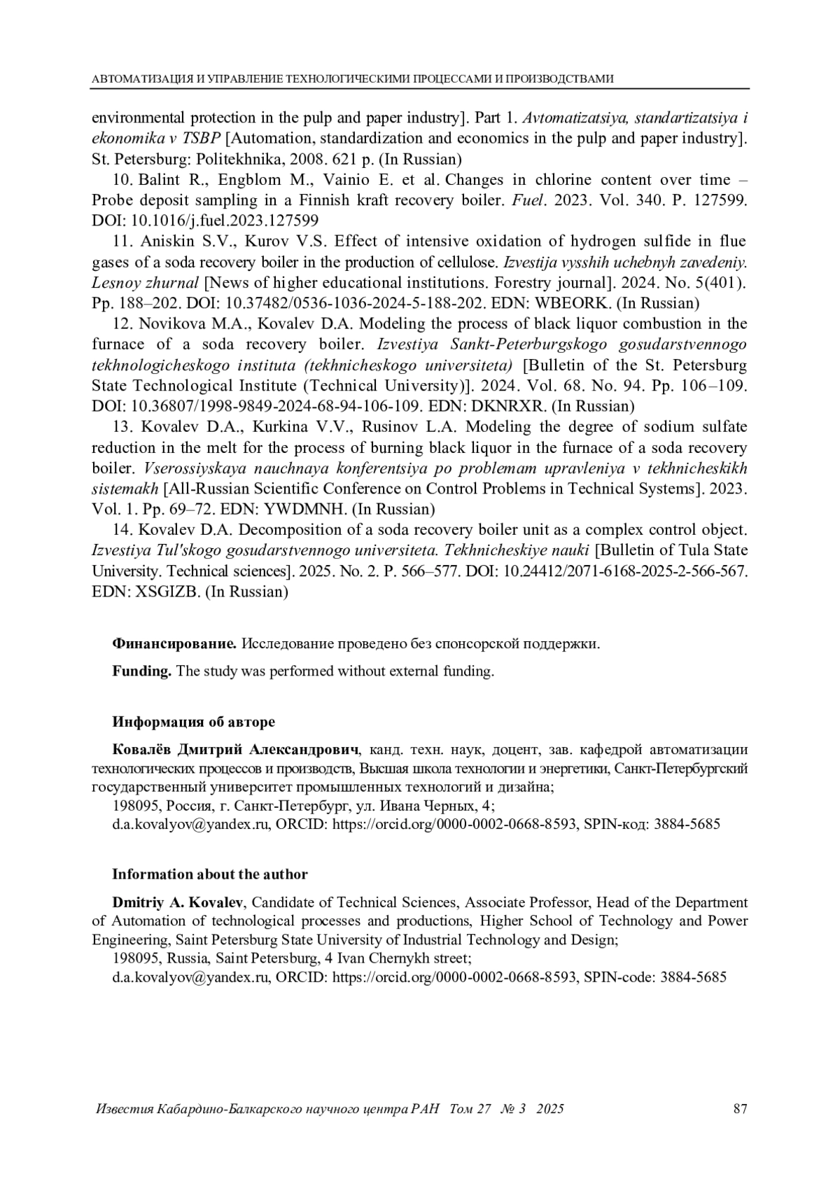13. Ковалёв Д. А., Куркина В. В., Русинов Л. А. Моделирование степени восстановления сульфата натрия в плаве для процесса сжигания черного щелока в топке содорегенерационного котлоагрегата // Всероссийская научная конференция по проблемам управления в технических системах. 2023. Т. 1. С. 69-72. EDN: YWDMNH
