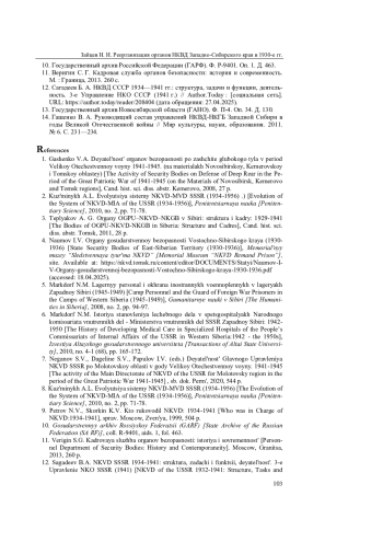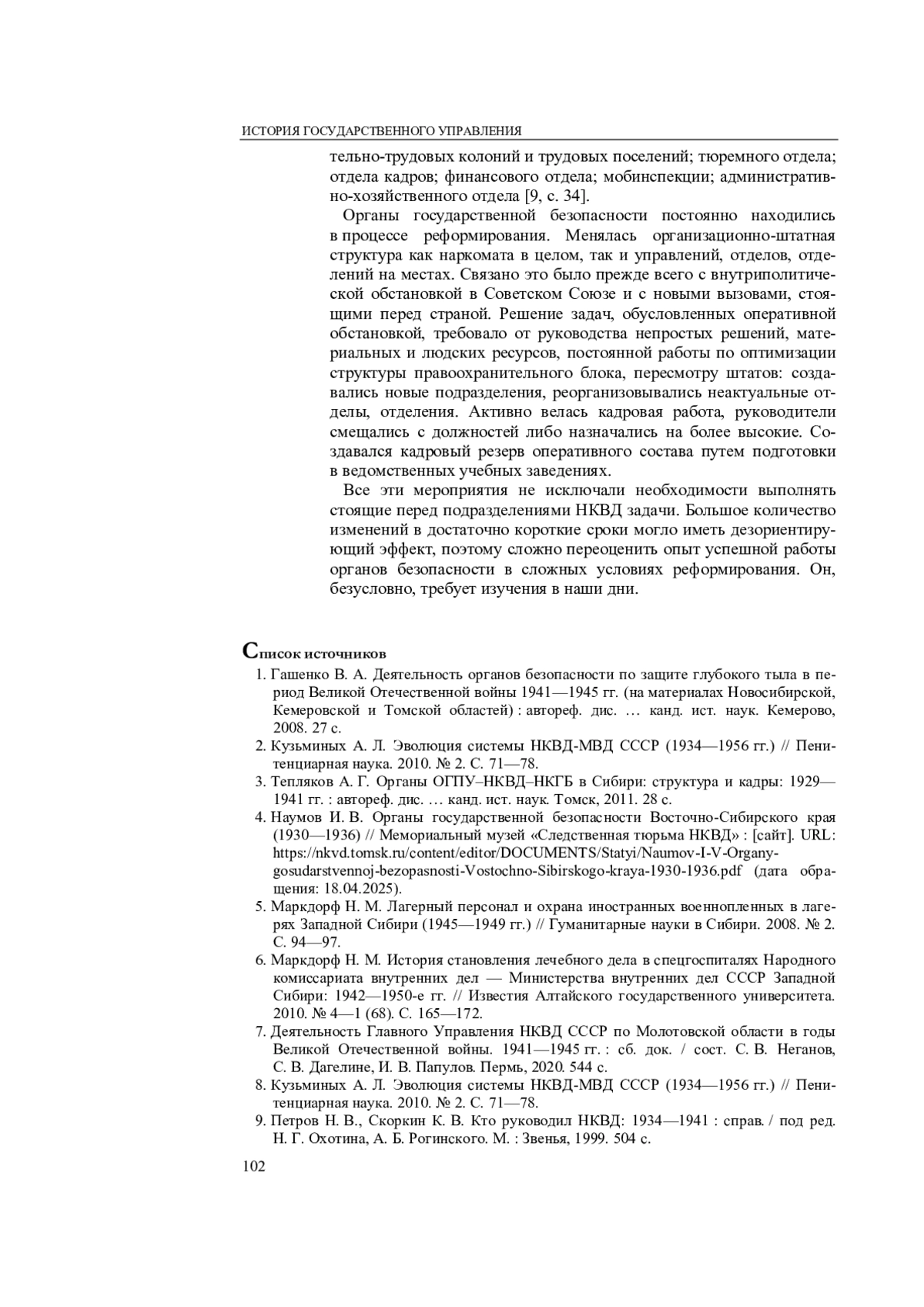 4. Наумов И. В. Органы государственной безопасности Восточно-Сибирского края (1930—1936) // Мемориальный музей «Следственная тюрьма НКВД» : [сайт]. URL: https://nkvd.tomsk.ru/content/editor/DOCUMENTS/Statyi/Naumov-I-V-Organygosudarstvennoj- bezopasnosti-Vostochno-Sibirskogo-kraya-1930-1936.pdf (дата обращения: 18.04.2025).