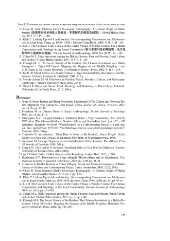 13. Cohen M. L. High Ancestors among the Hakka Chinese: Past and Present, Rural, Urban, and Global // Global Hakka Studies. 2017. N 8. P. 1—40.