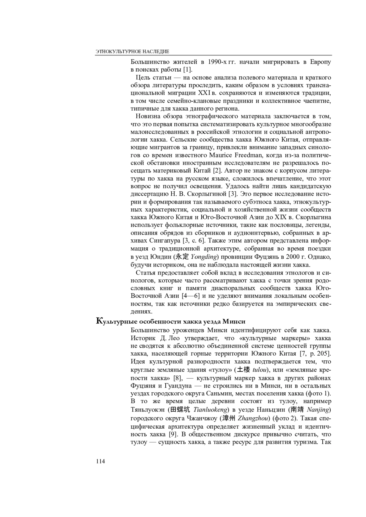 Статья основана на результатах этнографической полевой работы, проведенной в 2019—2020 гг. автором в деревнях небольшого уезда Минси (明溪 Mingxi) городского округа Саньмин (三明 Sanming) провинции Фуцзянь. Сельчане уезда называют себя «люди хакка» (客家人 kejia ren). Хакка — подгруппа хань, проживающая в горных районах провинций Гуандун, Фуцзянь и Цзянси, мало исследованная в российской науке. В исследованных деревнях автохтонное население хакка сопоставляет свои обычаи и обычаи приезжих. Деревни представляют любопытный пример сохранения идентичности в сочетании с транснациональным образом жизни (трудовая миграция).