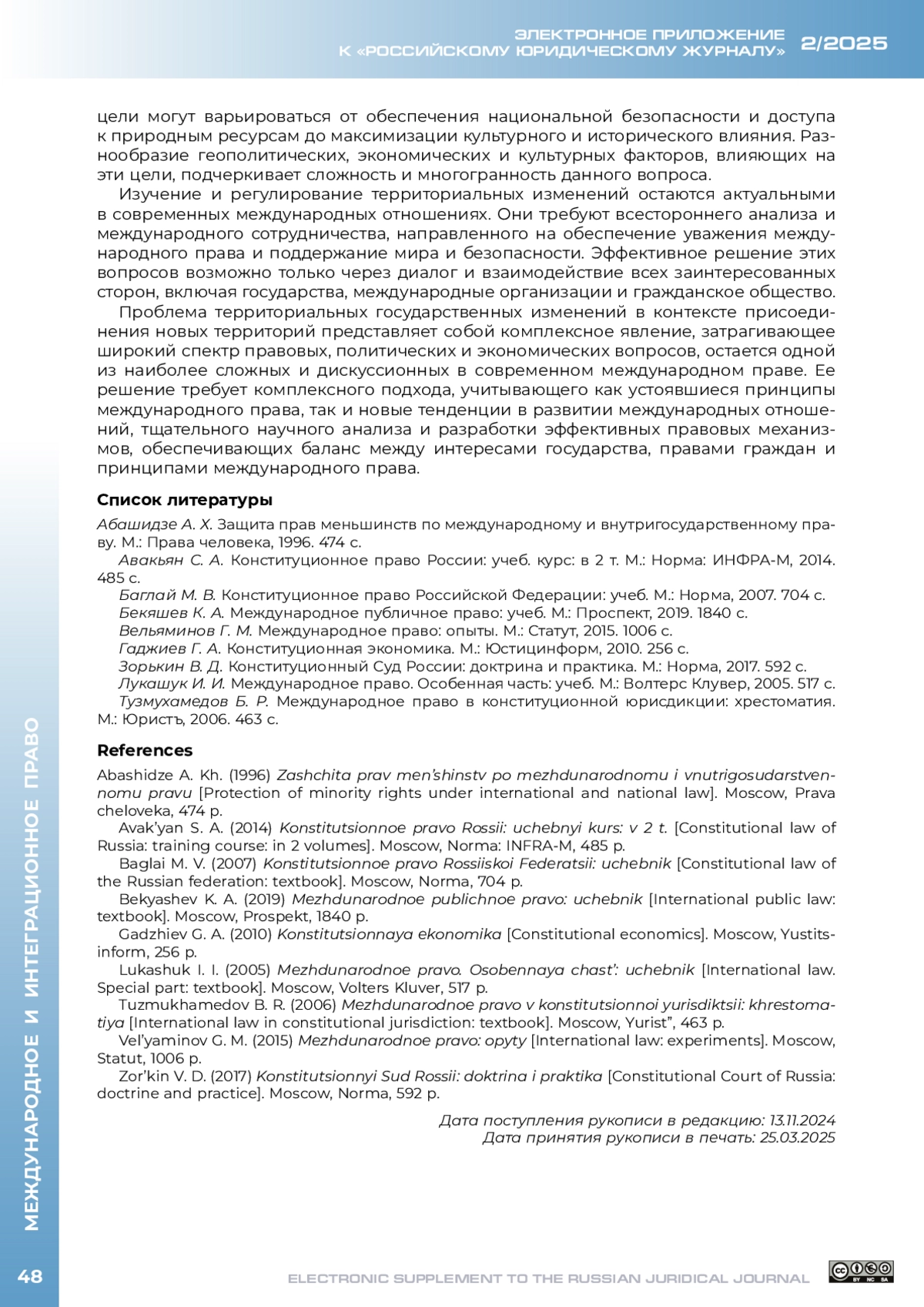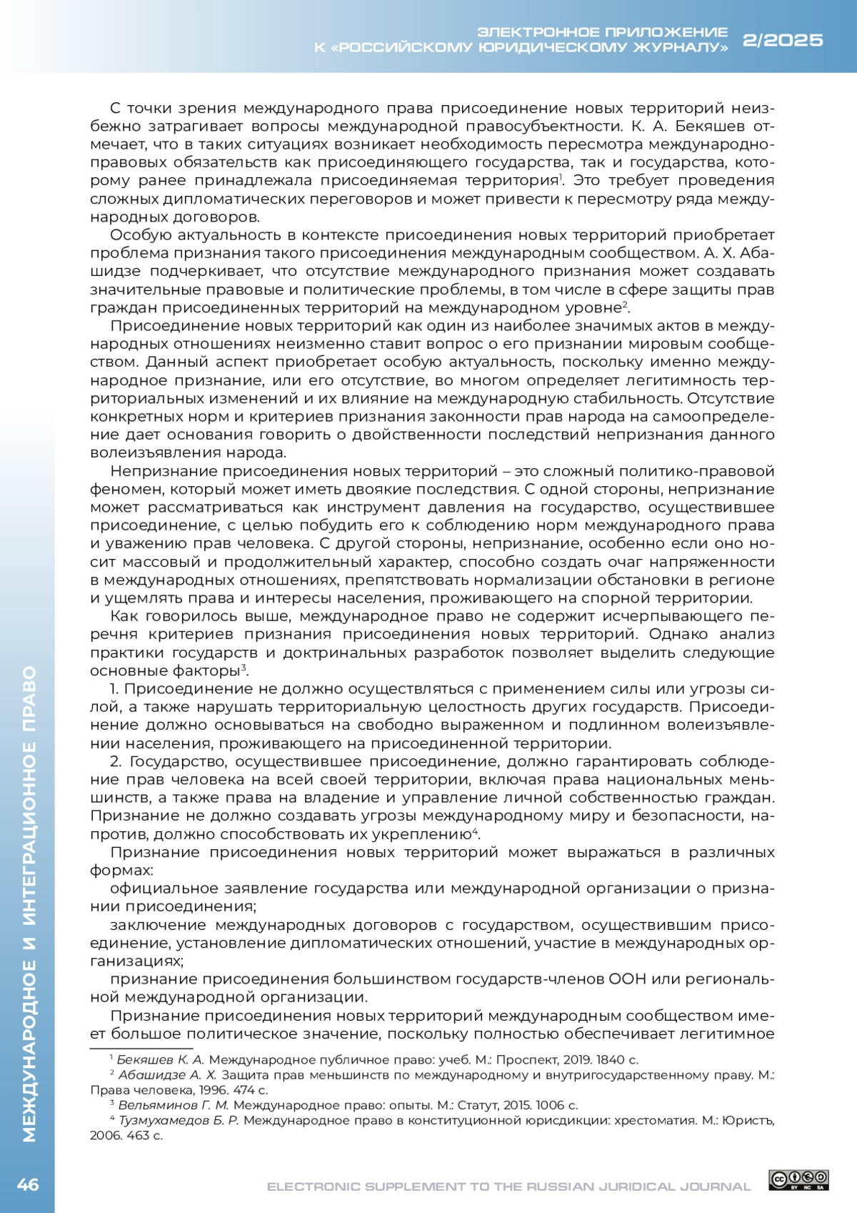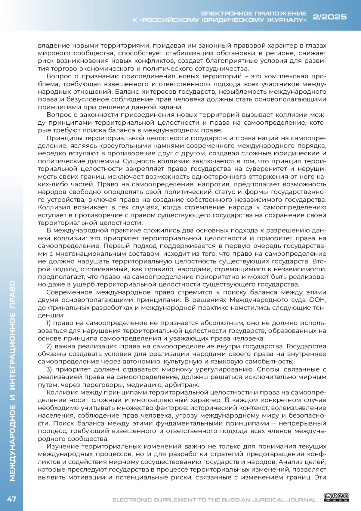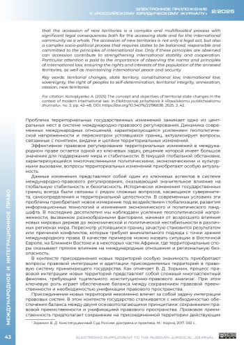 Анализируются различные доктринальные подходы к определению территориальных государственных изменений, выделяются их виды, а также рассматриваются основные цели, преследуемые государствами при их осуществлении. Особое внимание уделяется соотношению целей территориальных изменений с фундаментальными принципами международного права, такими как принцип территориальной целостности государств и право народов на самоопределение. Учитывая актуальность проблематики присоединения новых территорий в контексте современных международных отношений, акцент делается на правовой природе и специфических последствиях данного вида территориальных изменений. В статье отмечается, что присоединение новых территорий является сложным и многоаспектным процессом, имеющим значительные правовые последствия как для присоединяющего государства, так и для международного сообщества в целом. Присоединение новых территорий - это не только юридический акт, но и сложный социально-политический процесс, требующий от государств взвешенности, ответственности и приверженности принципам международного права. Только при соблюдении этих принципов присоединение может способствовать укреплению международной стабильности и сотрудничества. Подчеркивается важность соблюдения норм и принципов международного права, обеспечения прав и интересов населения присоединенных территорий, а также поддержания международного мира и безопасности.