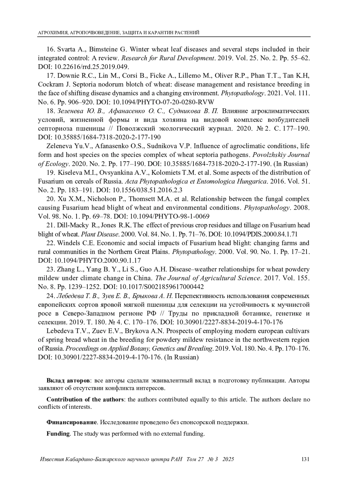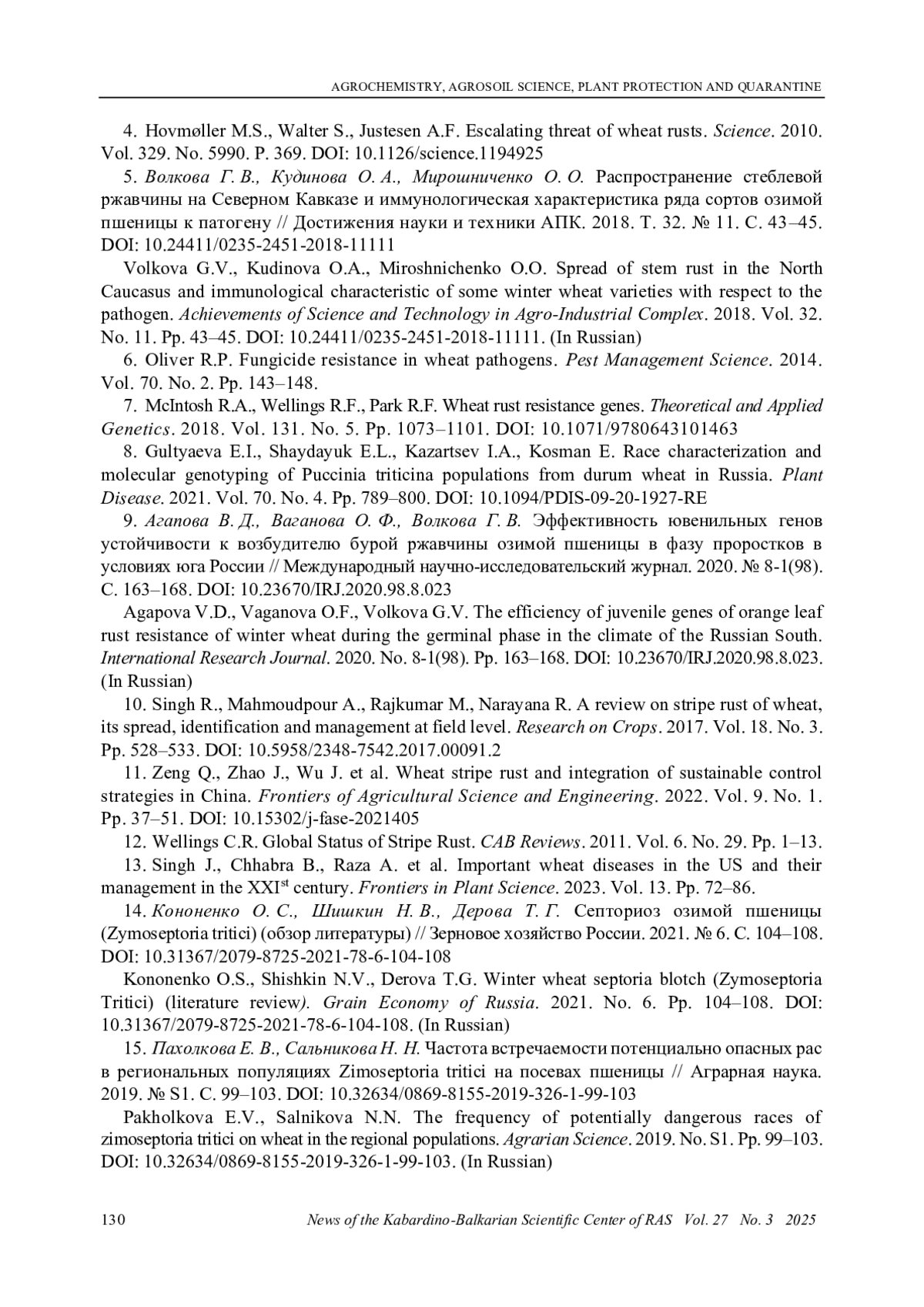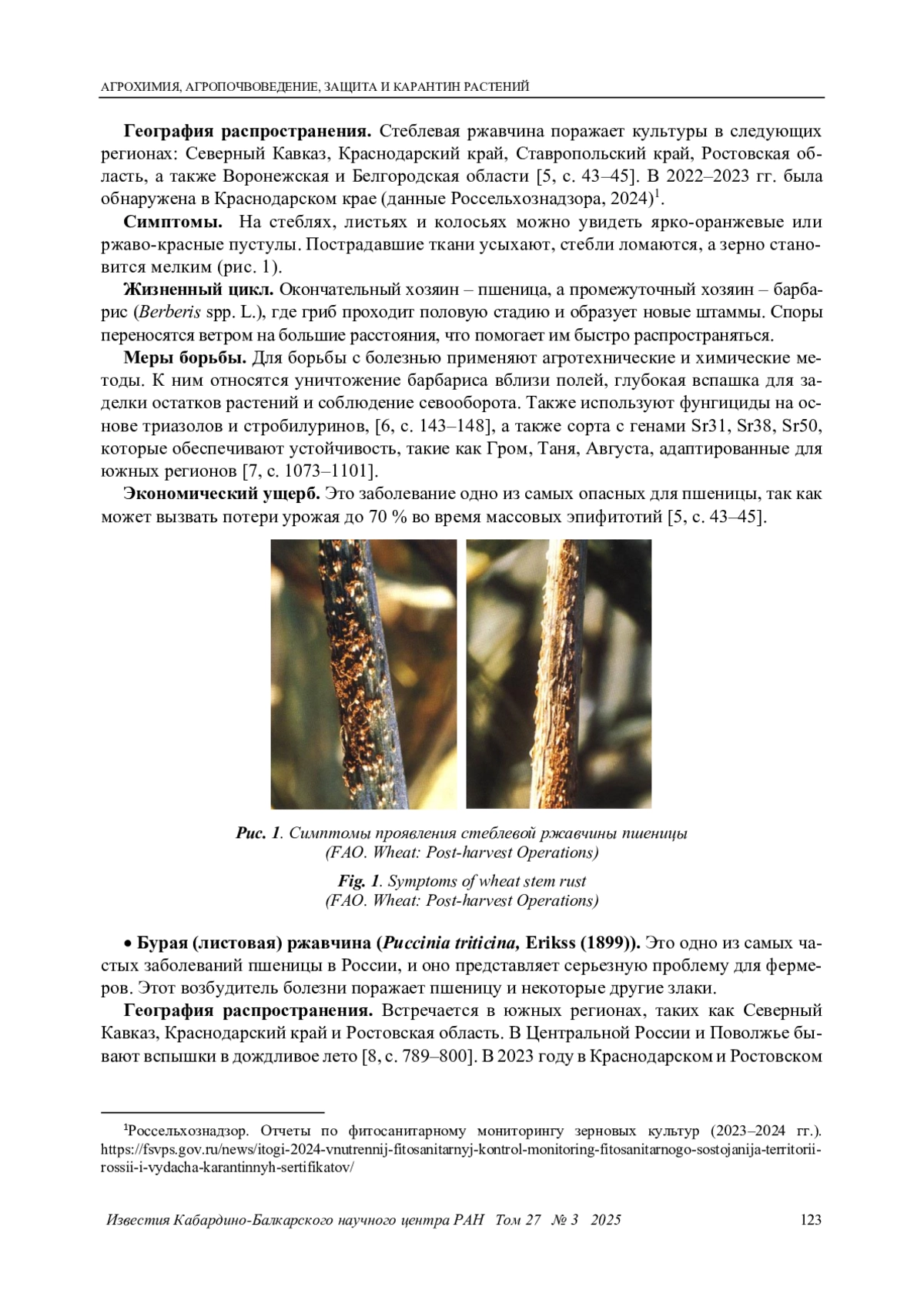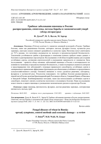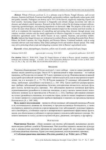 ДУКСИ Ф., ВАЛЛИ М. Х., ЗАРГАР М. ГРИБНЫЕ ЗАБОЛЕВАНИЯ ПШЕНИЦЫ В РОССИИ: РАСПРОСТРАНЕНИЕ, СИМПТОМЫ, МЕТОДЫ БОРЬБЫ И ЭКОНОМИЧЕСКИЙ УЩЕРБ (ОБЗОР ЛИТЕРАТУРЫ) // ИЗВЕСТИЯ КАБАРДИНО-БАЛКАРСКОГО НАУЧНОГО ЦЕНТРА РАН. 2025. ТОМ 27 № 3