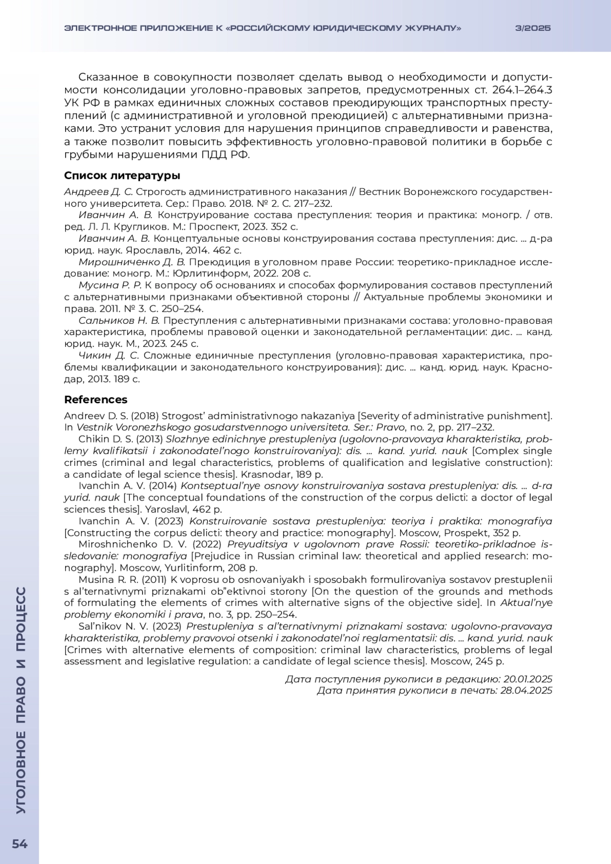 7. Чикин Д. С. Сложные единичные преступления (уголовно-правовая характеристика, проблемы квалификации и законодательного конструирования): дис.. канд. юрид. наук. Краснодар, 2013. 189 с. EDN: SUZYEX