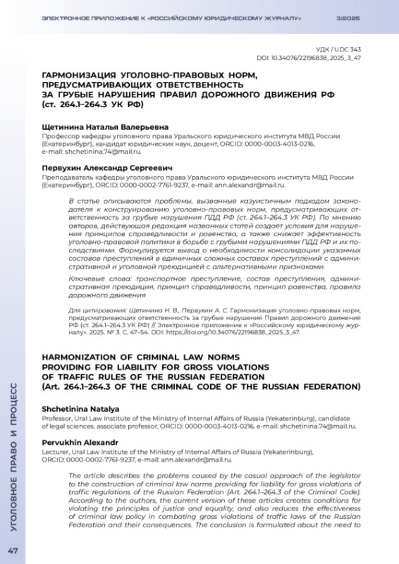 В статье описываются проблемы, вызванные казуистичным подходом законодателя к конструированию уголовно-правовых норм, предусматривающих ответственность за грубые нарушения ПДД РФ (ст. 264.1-264.3 УК РФ). По мнению авторов, действующая редакция названных статей создает условия для нарушения принципов справедливости и равенства, а также снижает эффективность уголовно-правовой политики в борьбе с грубыми нарушениями ПДД РФ и их последствиями. Формулируется вывод о необходимости консолидации указанных составов преступлений в единичных сложных составах преступлений с административной и уголовной преюдицией с альтернативными признаками.