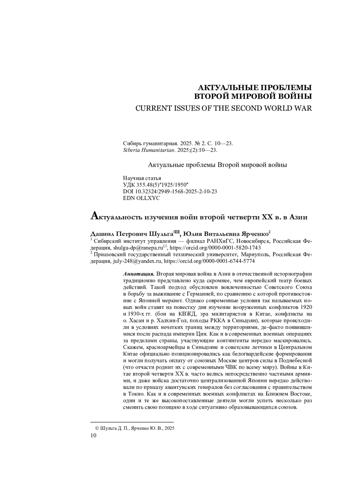 Вторая мировая война в Азии в отечественной историографии традиционно представлено куда скромнее, чем европейский театр боевых действий. Такой подход обусловлен вовлеченностью Советского Союза в борьбу за выживание с Германией, по сравнению с которой противостояние с Японией меркнет. Однако современные условия так называемых новых войн ставят на повестку дня изучение вооруженных конфликтов 1920 и 1930-х гг. (бои на КВЖД, эра милитаристов в Китае, конфликты на о. Хасан и р. Халхин-Гол, походы РККА в Синьцзян), которые происходили в условиях нечетких границ между территориями, де-факто появившимися после распада империи Цин. Как и в современных военных операциях за пределами страны, участвующие контингенты нередко маскировались. Скажем, красноармейцы в Синьцзяне и советские летчики в Центральном Китае официально позиционировались как белогвардейские формирования и могли получать оплату от союзных Москве центров силы в Поднебесной (что отчасти роднит их с современными ЧВК по всему миру). Войны в Китае второй четверти XX в. часто велись непосредственно частными армиями, и даже войска достаточно централизованной Японии нередко действовали по приказу квантунских генералов без согласования с правительством в Токио. Как и в современных военных конфликтах на Ближнем Востоке, одни и те же высокопоставленные деятели могли успеть несколько раз сменить свою позицию в ходе ситуативно образовывающихся союзов.