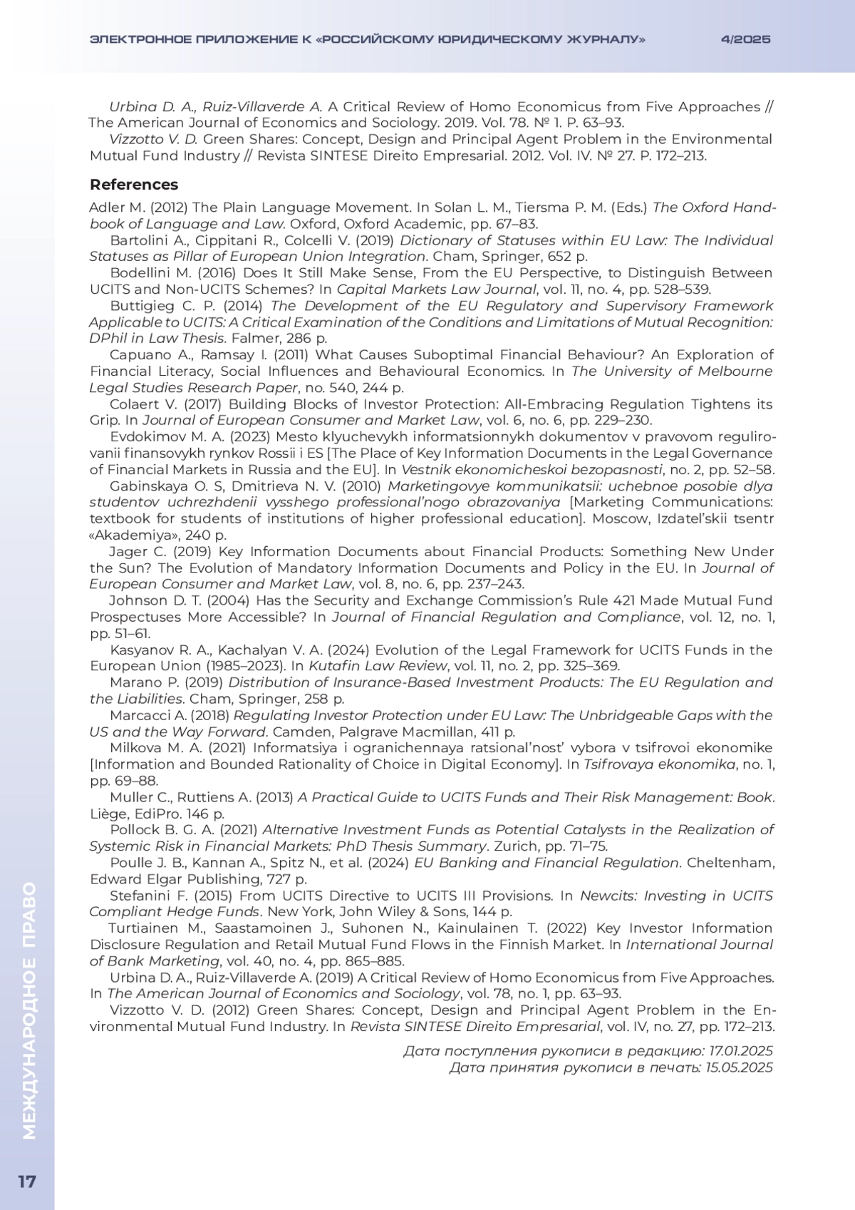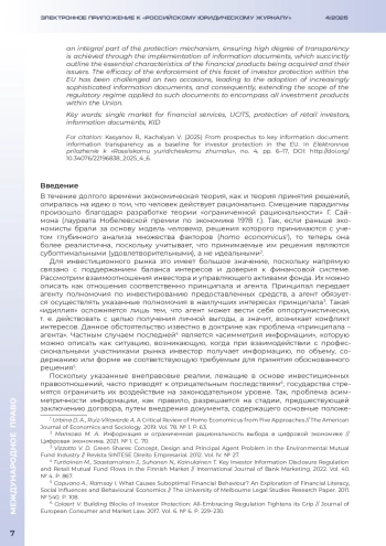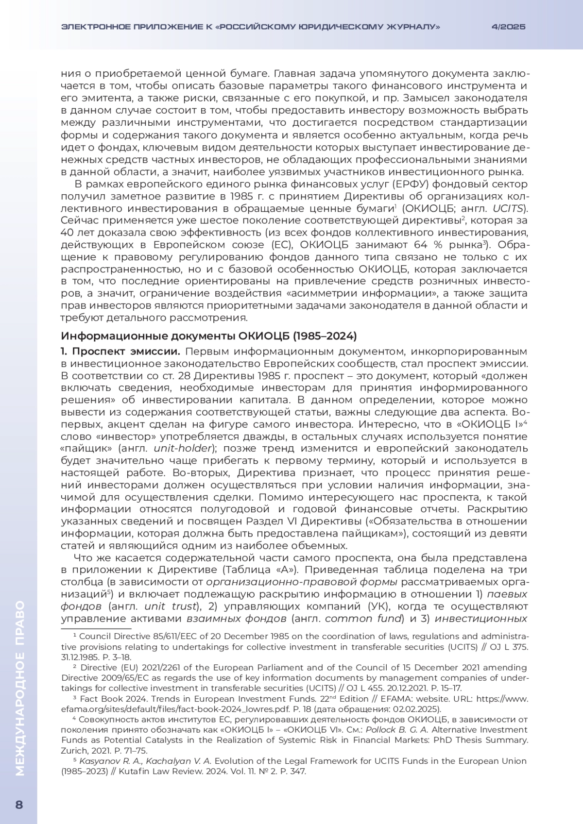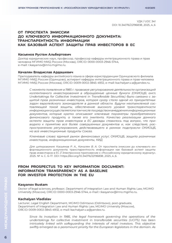 КАСЬЯНОВ Р. А., КАЧАЛЯН В. А. ОТ ПРОСПЕКТА ЭМИССИИ ДО КЛЮЧЕВОГО ИНФОРМАЦИОННОГО ДОКУМЕНТА: ТРАНСПАРЕНТНОСТЬ ИНФОРМАЦИИ КАК БАЗОВЫЙ АСПЕКТ ЗАЩИТЫ ПРАВ ИНВЕСТОРОВ В ЕС // ЭЛЕКТРОННОЕ ПРИЛОЖЕНИЕ К РОССИЙСКОМУ ЮРИДИЧЕСКОМУ ЖУРНАЛУ. 2025. № 4