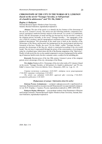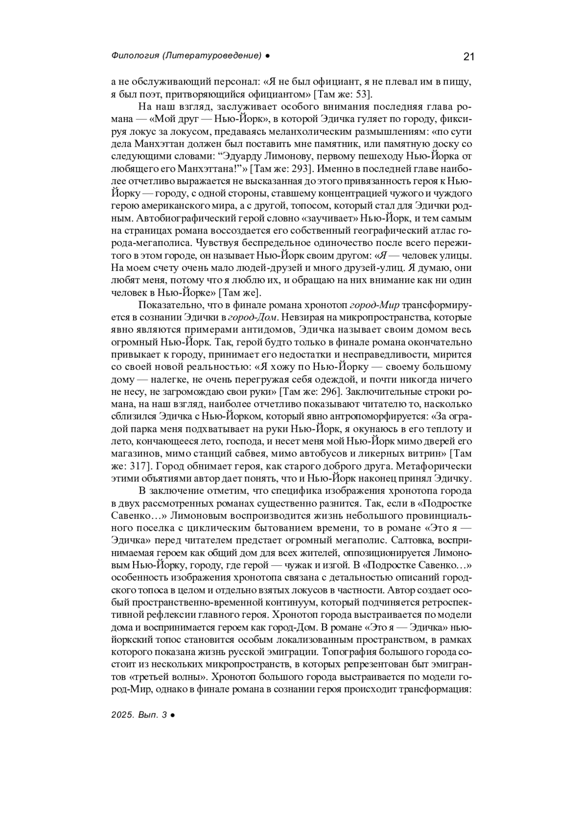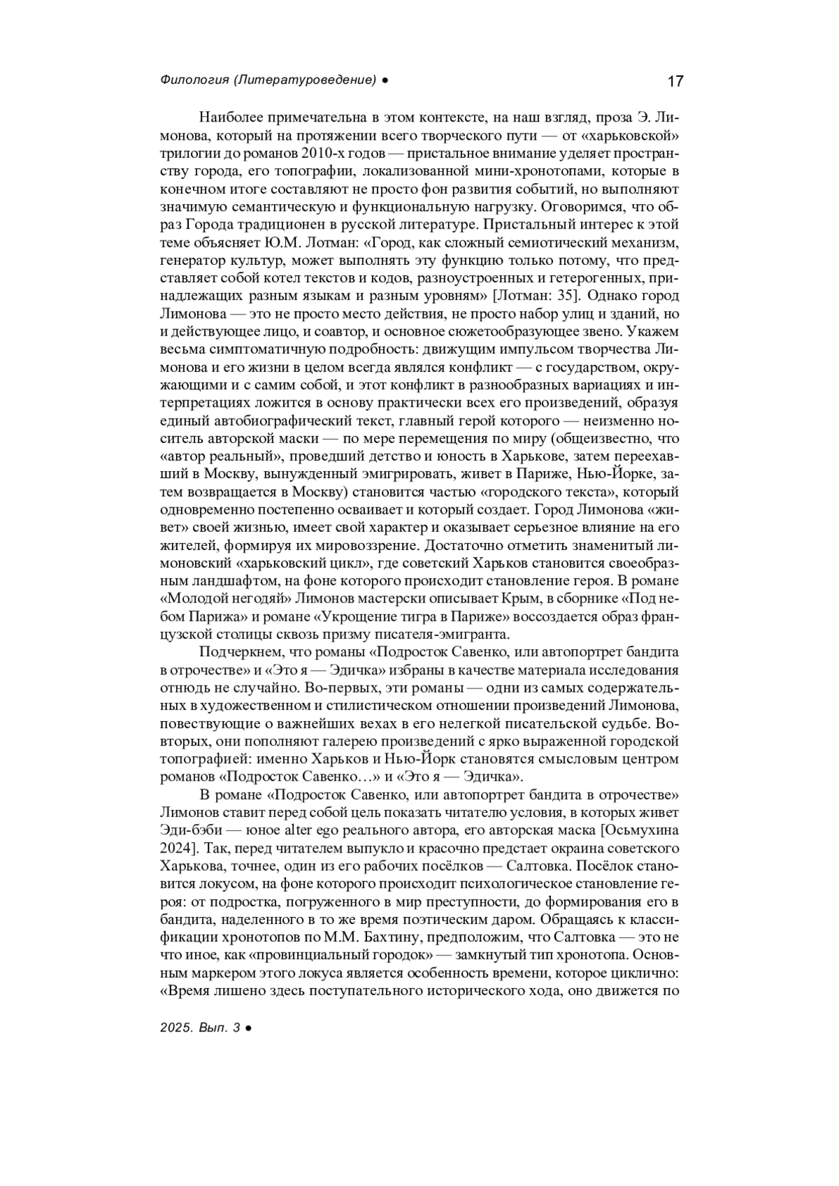 Статья: ХРОНОТОП ГОРОДА В ТВОРЧЕСТВЕ Э. ЛИМОНОВА (НА МАТЕРИАЛЕ РОМАНОВ «ПОДРОСТОК САВЕНКО, ИЛИ АВТОПОРТРЕТ БАНДИТА В ОТРОЧЕСТВЕ» И «ЭТО Я - ЭДИЧКА») (2025)
