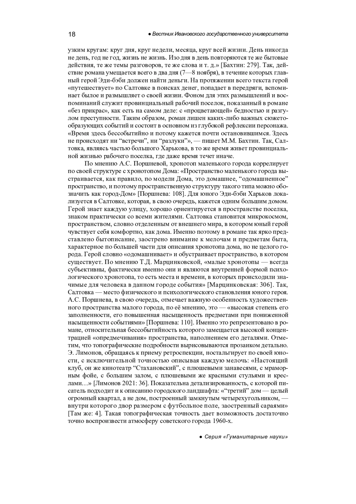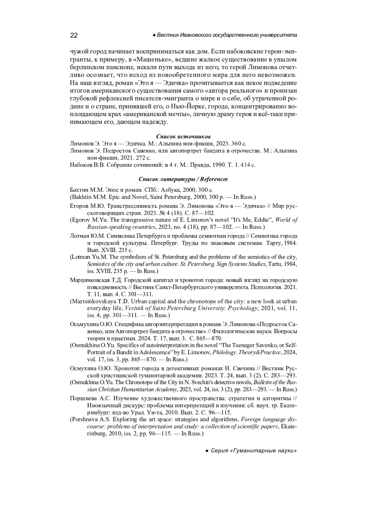 КАДЕЕВА Р. А. ХРОНОТОП ГОРОДА В ТВОРЧЕСТВЕ Э. ЛИМОНОВА (НА МАТЕРИАЛЕ РОМАНОВ «ПОДРОСТОК САВЕНКО, ИЛИ АВТОПОРТРЕТ БАНДИТА В ОТРОЧЕСТВЕ» И «ЭТО Я - ЭДИЧКА») // ВЕСТНИК ИВАНОВСКОГО ГОСУДАРСТВЕННОГО УНИВЕРСИТЕТА. СЕРИЯ: ГУМАНИТАРНЫЕ НАУКИ. 2025. № 3