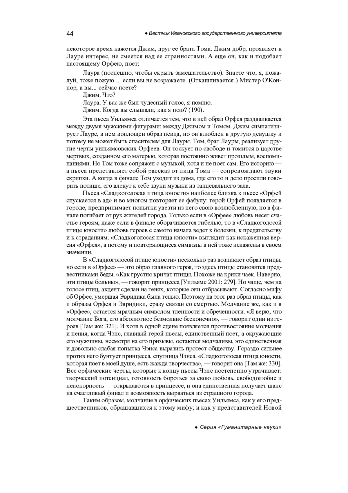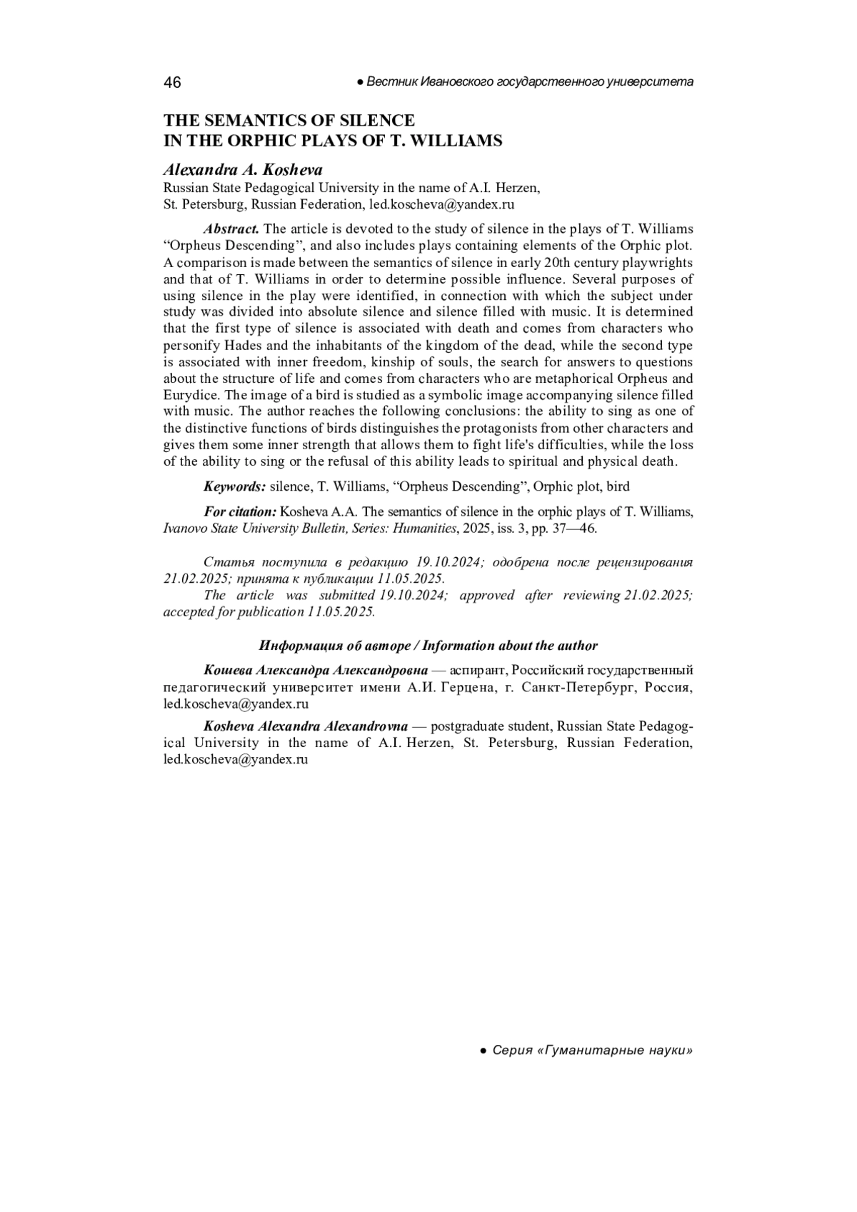 КОШЕВА А. А. СЕМАНТИКА БЕЗМОЛВИЯ В ОРФИЧЕСКИХ ПЬЕСАХ Т. УИЛЬЯМСА // ВЕСТНИК ИВАНОВСКОГО ГОСУДАРСТВЕННОГО УНИВЕРСИТЕТА. СЕРИЯ: ГУМАНИТАРНЫЕ НАУКИ. 2025. № 3