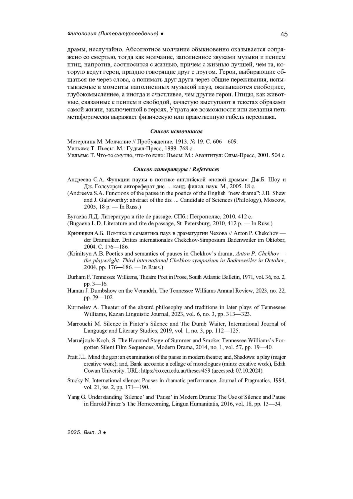Статья: СЕМАНТИКА БЕЗМОЛВИЯ В ОРФИЧЕСКИХ ПЬЕСАХ Т. УИЛЬЯМСА (2025)