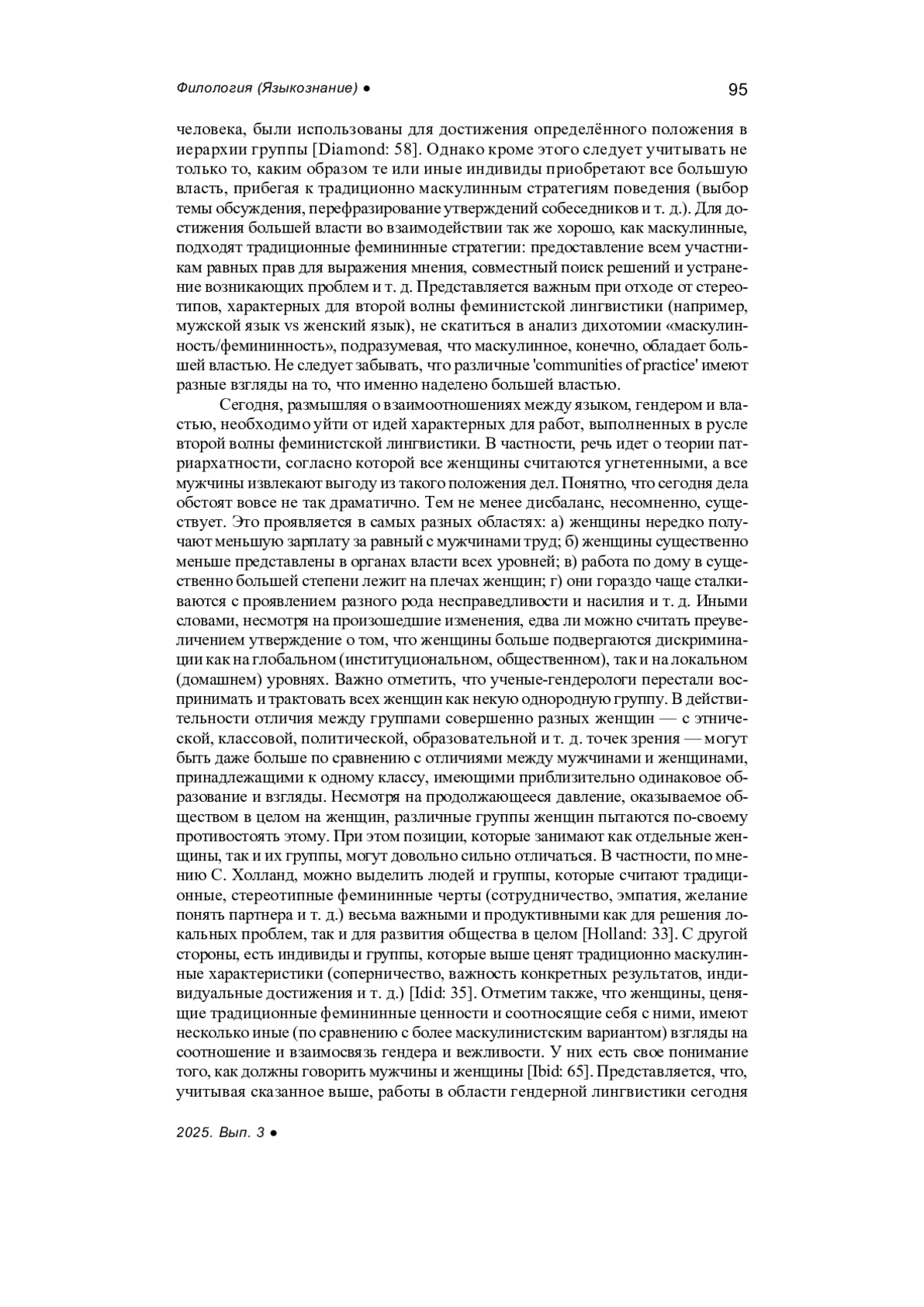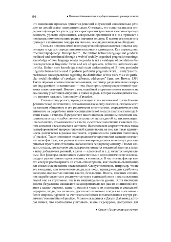 Как известно, ученые, работавшие в русле постулатов так называемой второй волны феминистской лингвистики, исходили из принципа об эссенциалистской сущности гендера, из того, что у этого явления существуют некие неотъемлемые, фиксированные, связанные прежде всего с биологией, черты. Подобный подход к анализу языкового материала был и остается по -своему привлекательным и удобным, т. к. позволяет анализировать полученные экспериментальные данные в рамках бинарной модели о гендерных различиях. К тому же рассмотрение гендера в качестве фактора, который оказывает влияние или даже определяет языковую деятельность всех женщин вообще, способствует упрощению исследовательской работы. Очевидно, однако, что предположение об однородности/гомогенности всех женщин (или мужчин) не способствует точной оценке и пониманию той роли, которую в языке играет гендер.