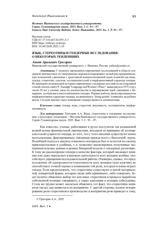 С момента зарождения современных исследований в области гендерной лингвистики это направление пережило/переживает целый ряд принципиальных изменений, связанных с трактовкой взаимоотношений таких понятий как язык, гендер, стереотип, сексизм, эссенциалистский и перформативный характер гендера. Из примерно полувековой истории современных гендерных штудий (если отправной точкой считать книгу Р. Лакофф “Language and Woman’s Place”, вышедшую в 1975 году), около 30 лет у ученых ушло на доказательство и опровержение идей, связанных с бинарным, эссециалистским пониманием гендера. Первые работы, фокусирующиеся на перформативном характере гендера, на внимании к ‘doing gender’ появились на рубеже веков. Сегодня именно такое понимание гендера является доминантным