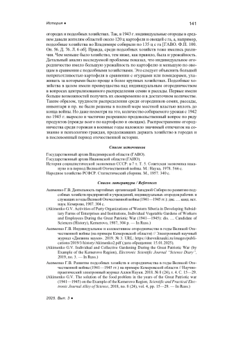 Статья: ИНДИВИДУАЛЬНОЕ ОГОРОДНИЧЕСТВО В ГОДЫ ВЕЛИКОЙ ОТЕЧЕСТВЕННОЙ ВОЙНЫ (НА ПРИМЕРЕ ВЛАДИМИРСКОЙ И ИВАНОВСКОЙ ОБЛАСТЕЙ) (2025)