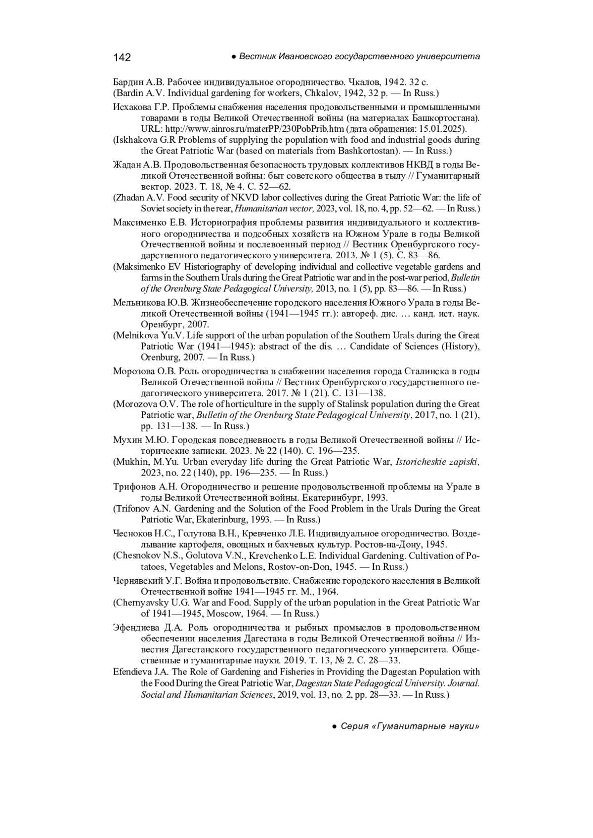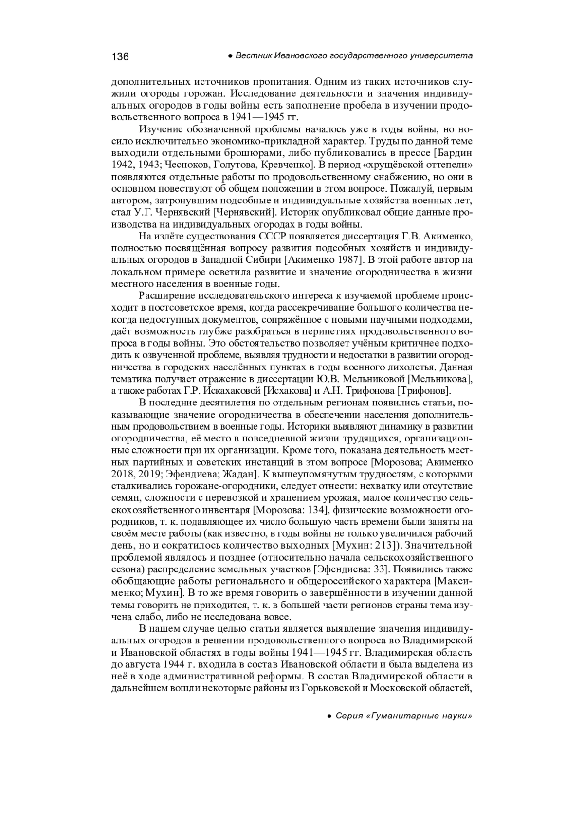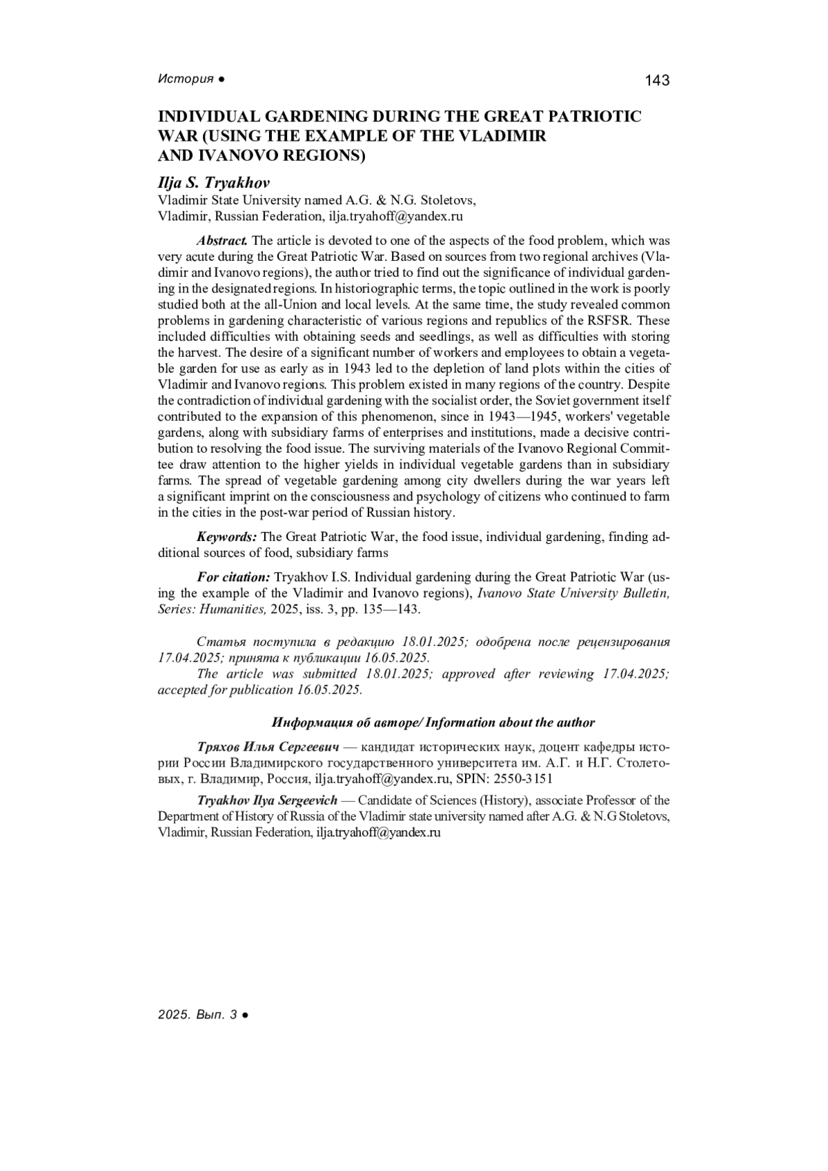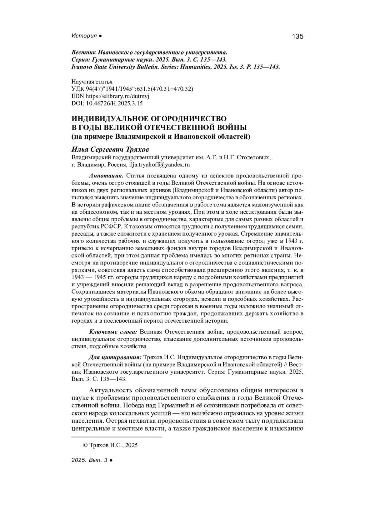 ТРЯХОВ И. С. ИНДИВИДУАЛЬНОЕ ОГОРОДНИЧЕСТВО В ГОДЫ ВЕЛИКОЙ ОТЕЧЕСТВЕННОЙ ВОЙНЫ (НА ПРИМЕРЕ ВЛАДИМИРСКОЙ И ИВАНОВСКОЙ ОБЛАСТЕЙ) // ВЕСТНИК ИВАНОВСКОГО ГОСУДАРСТВЕННОГО УНИВЕРСИТЕТА. СЕРИЯ: ГУМАНИТАРНЫЕ НАУКИ. 2025. № 3