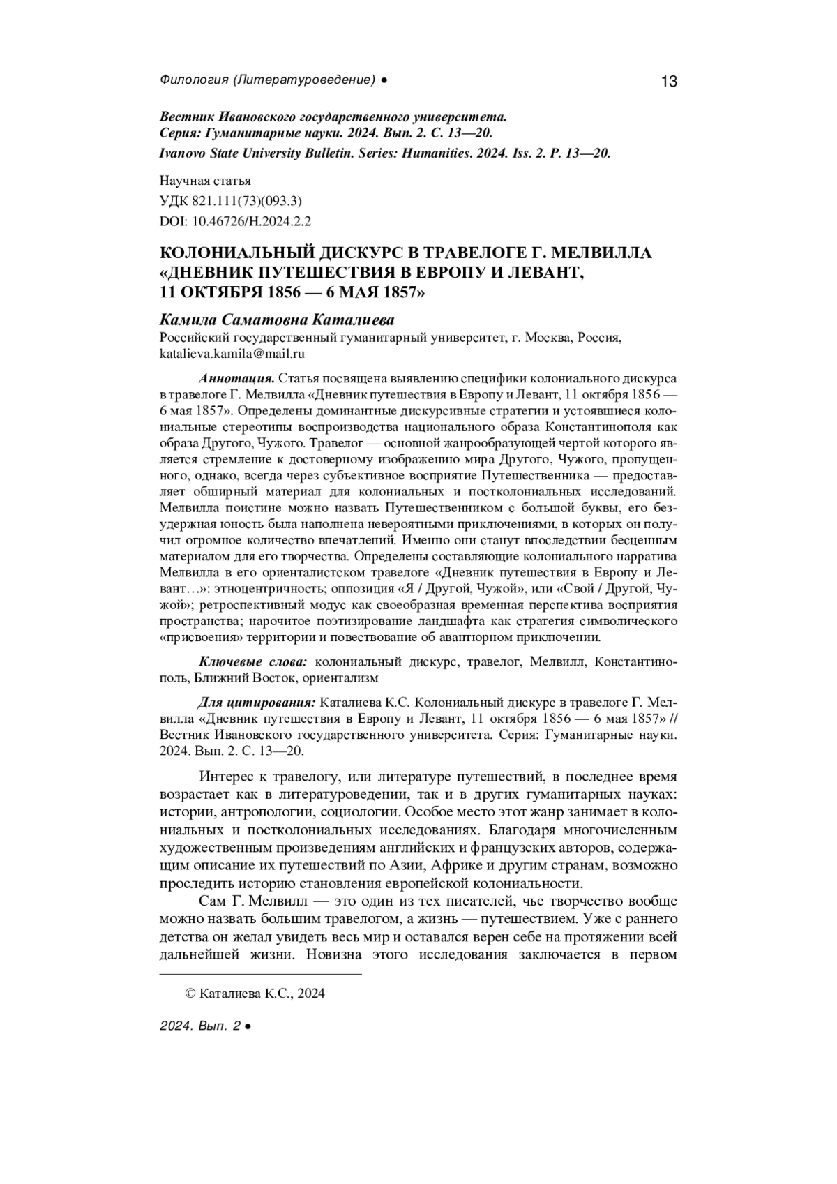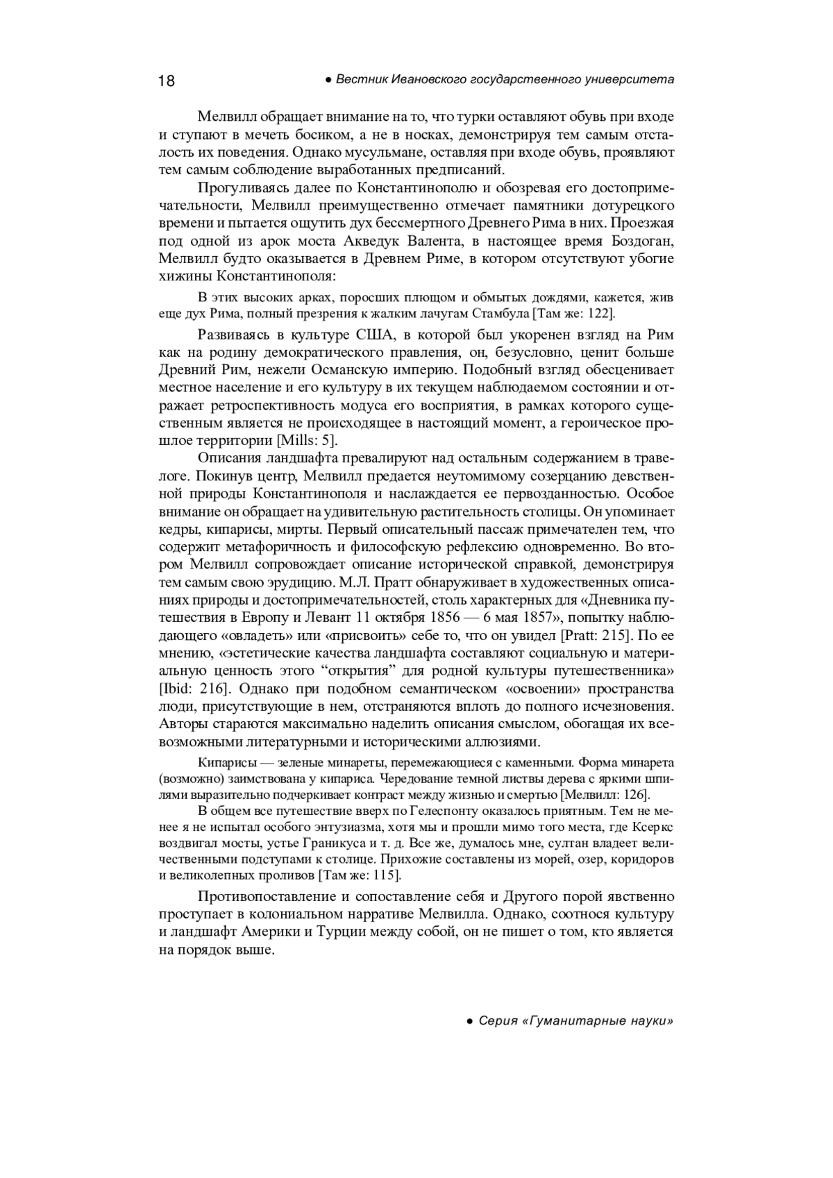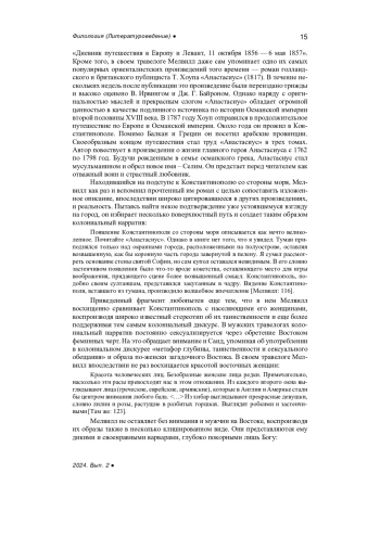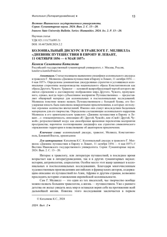 Статья посвящена выявлению специфики колониального дискурса в травелоге Г. Мелвилла «Дневник путешествия в Европу и Левант, 11 октября 1856 — 6 мая 1857». Определены доминантные дискурсивные стратегии и устоявшиеся колониальные стереотипы воспроизводства национального образа Константинополя как образа Другого, Чужого. Травелог — основной жанрообразующей чертой которого является стремление к достоверному изображению мира Другого, Чужого, пропущенного, однако, всегда через субъективное восприятие Путешественника — предоставляет обширный материал для колониальных и постколониальных исследований. Мелвилла поистине можно назвать Путешественником с большой буквы, его безудержная юность была наполнена невероятными приключениями, в которых он получил огромное количество впечатлений. Именно они станут впоследствии бесценным материалом для его творчества. Определены составляющие колониального нарратива Мелвилла в его ориенталистском травелоге «Дневник путешествия в Европу и Левант…»: этноцентричность; оппозиция «Я / Другой, Чужой», или «Свой / Другой, Чужой»; ретроспективный модус как своеобразная временная перспектива восприятия пространства; нарочитое поэтизирование ландшафта как стратегия символического «присвоения» территории и повествование об авантюрном приключении.