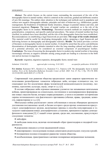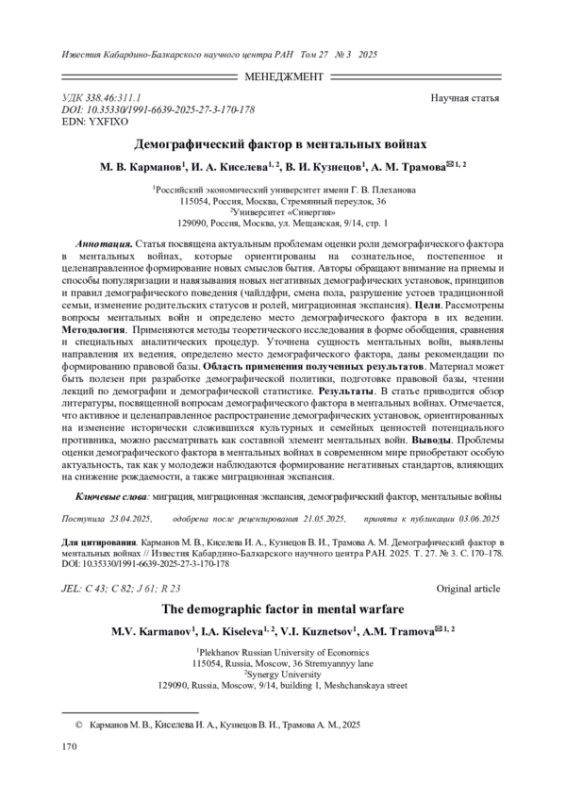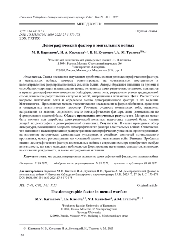 КАРМАНОВ М. В., КИСЕЛЕВА И. А., КУЗНЕЦОВ В. И., ТРАМОВА А. М. ДЕМОГРАФИЧЕСКИЙ ФАКТОР В МЕНТАЛЬНЫХ ВОЙНАХ // ИЗВЕСТИЯ КАБАРДИНО-БАЛКАРСКОГО НАУЧНОГО ЦЕНТРА РАН. 2025. ТОМ 27 № 3