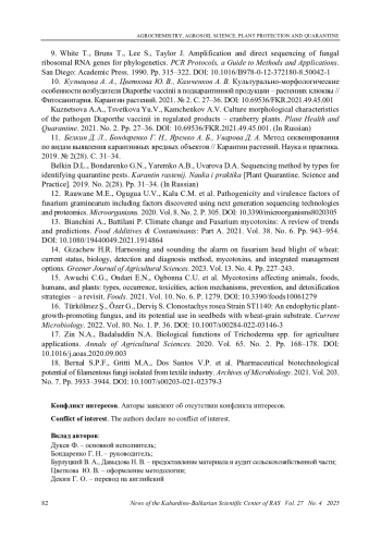 10. Кузнецова А. А., Цветкова Ю. В., Камченков А. В. Культурально-морфологические особенности возбудителя Diaporthe vaccinii в подкарантинной продукции - растениях клюквы // Фитосанитария. Карантин растений. 2021. № 2. С. 27-36. DOI: 10.69536/FKR.2021.49.45.001 EDN: IKVGFT Kuznetsova A.A., Tsvetkova Yu.V., Kamchenkov A.V. Culture morphological characteristics of the pathogen Diaporthe vaccinii in regulated products - cranberry plants. Plant Health and Quarantine. 2021. No. 2. Pp. 27-36. (In Russian). DOI: 10.69536/FKR.2021.49.45.001