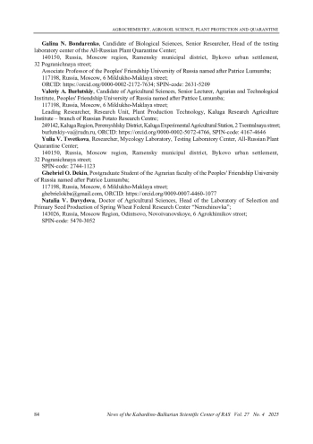Материалы и методы. Генотипы мягкой яровой пшеницы, созданные с применением современных селекционно-генетических подходов (гапло-биотехнологии, эколого-географического метода подбора родительских пар при конструировании сложных ярово-озимых гибридов). Применен микробиологический метод (выделение возбудителя на питательную среду, получение чистой культуры), включая идентификацию морфологическим методом (микроскопия). Результаты первичной диагностики подтверждены применением полимеразной цепной реакции (ПЦР), основывающейся на использовании праймеров, разработанных на участок ITS-гена, с последующим секвенированием по Сэнгеру.