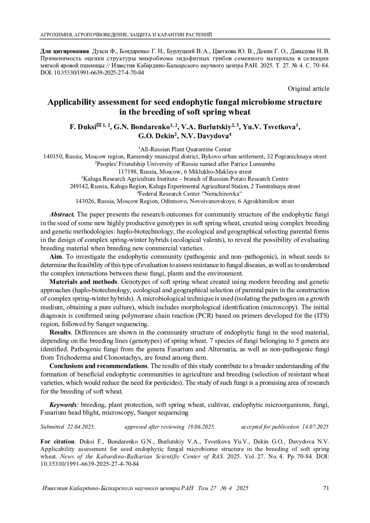 Цель исследования - изучение сообщества эндофитных грибов (патогенных и непатогенных) в семенном материале пшеницы для определения возможности применимости такого рода оценки в селекции на устойчивость к грибным патогенам, а также для понимания их сложных взаимодействий с растениями и окружающей средой.