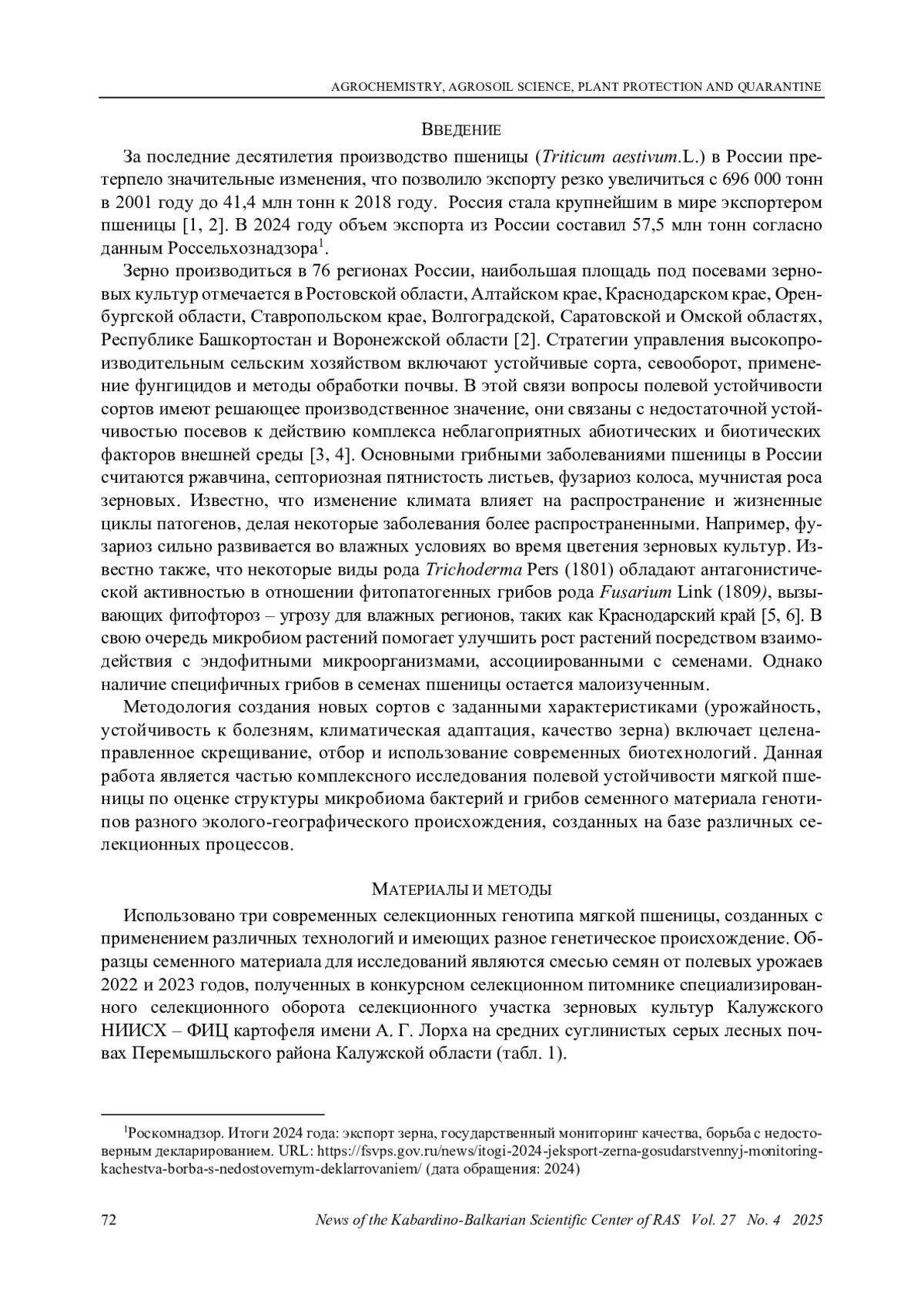 Выводы и рекомендации. Результаты данного исследования являются частью комплексного подхода и способствуют изучению формирования полезных эндофитных сообществ для использования в сельскохозяйственных и селекционных целях (подбор устойчивых сортов пшеницы и сокращение использования пестицидов). Изучение таких грибов - перспективное направление в селекции мягкой пшеницы.