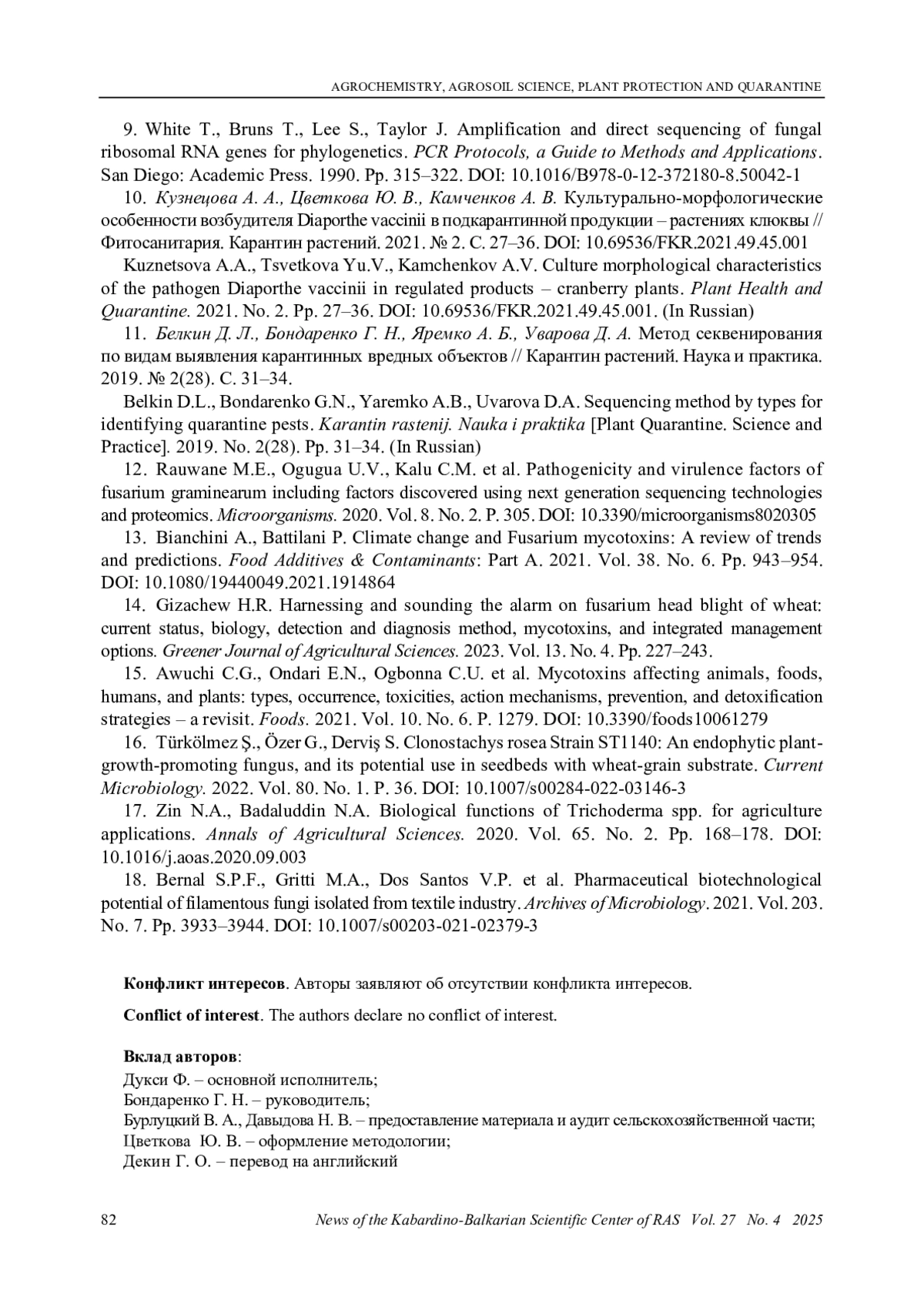 16. Türkölmez Ş., Özer G., Derviş S. Clonostachys rosea Strain ST1140: An endophytic plantgrowth-promoting fungus, and its potential use in seedbeds with wheat-grain substrate. Current Microbiology. 2022. Vol. 80. No. 1. P. 36. DOI: 10.1007/s00284-022-03146-3 EDN: HOMYAZ