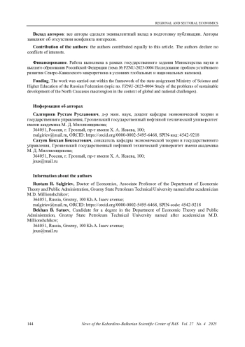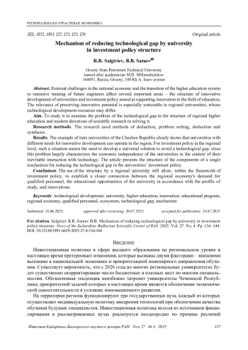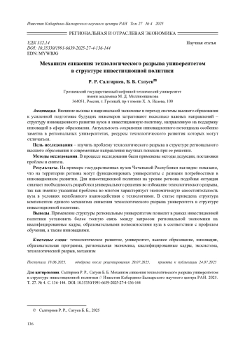 САЛГИРИЕВ Р. Р., САТУЕВ Б. Б. МЕХАНИЗМ СНИЖЕНИЯ ТЕХНОЛОГИЧЕСКОГО РАЗРЫВА УНИВЕРСИТЕТОМ В СТРУКТУРЕ ИНВЕСТИЦИОННОЙ ПОЛИТИКИ // ИЗВЕСТИЯ КАБАРДИНО-БАЛКАРСКОГО НАУЧНОГО ЦЕНТРА РАН. 2025. ТОМ 27 № 4