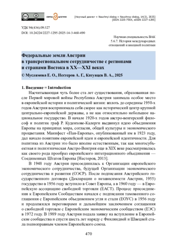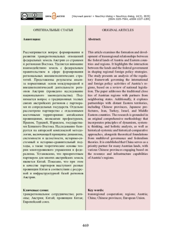 Рассматривается вопрос формирования и развития трансрегиональных отношений федеральных земель Австрии со странами и регионами Востока. Уделяется внимание взаимодействию земель с федеральным правительством в сфере формирования региональных внешнеполитических стратегий. Представлены результаты анализа нормативных основ международной и внешнеполитической деятельности регионов Австрии (проведено исследование национального законодательства). Поднимается вопрос о традиционных тесных связях австрийских регионов с партнерами из сопредельных государств. Отдельно рассмотрено партнерство с отдаленными восточными территориями: китайскими провинциями, японскими префектурами, Ираном, Турцией, Израилем, государствами Ближнего Востока. Исследование базируется на авторской комплексной методологии, включающей принципы динамизма, системности и целостности, историко-системный и историко-сравнительный подходы, а также теоретические основы теории многоуровневого управления и федерализма. Установлено, что приоритетным партнером для многих австрийских земель является Китай. Показано, что при этом в качестве партнеров выступают разные провинции Китая в соответствии с ресурсной и инфраструктурной базой регионов Австрии.