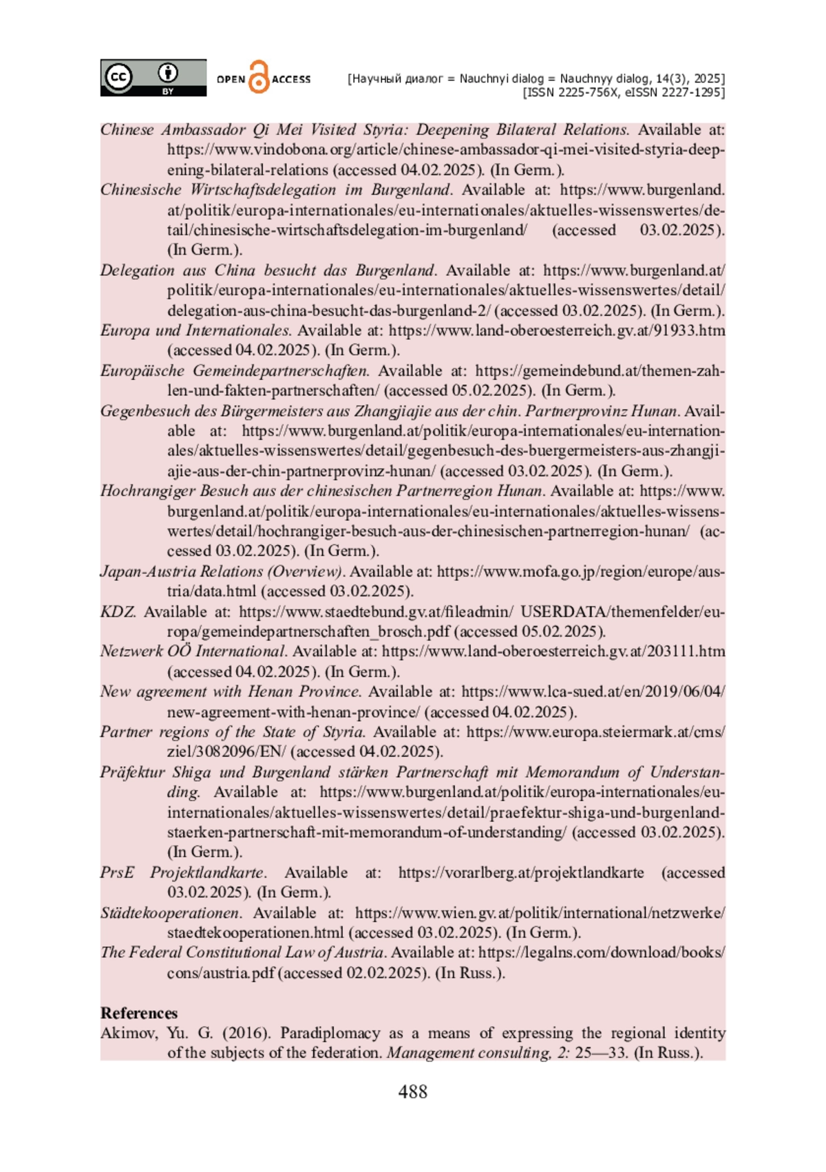 1. Акимов Ю. Г. Парадипломатия как средство выражения региональной идентичности субъектов федераций / Ю. Г. Акимов// Управленческое консультирование. - 2016. - № 2. - С. 25-33.