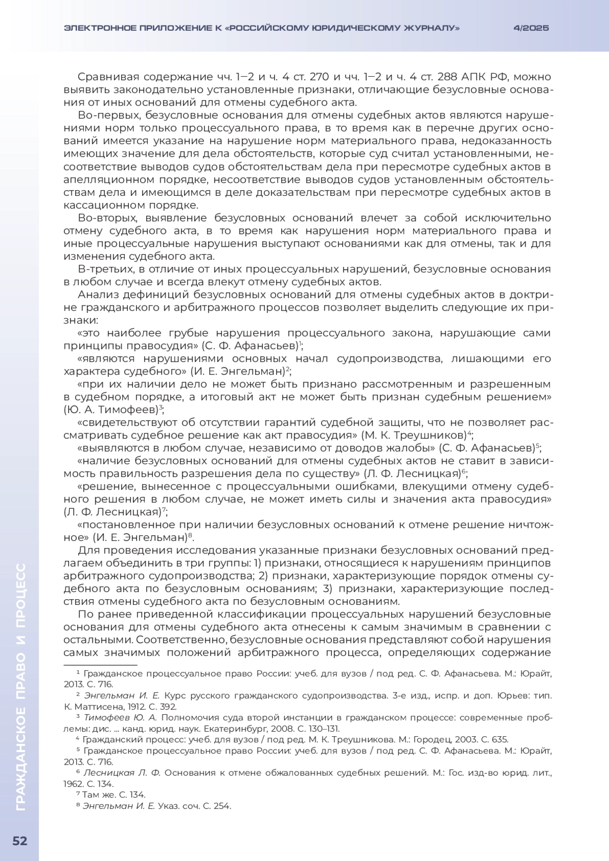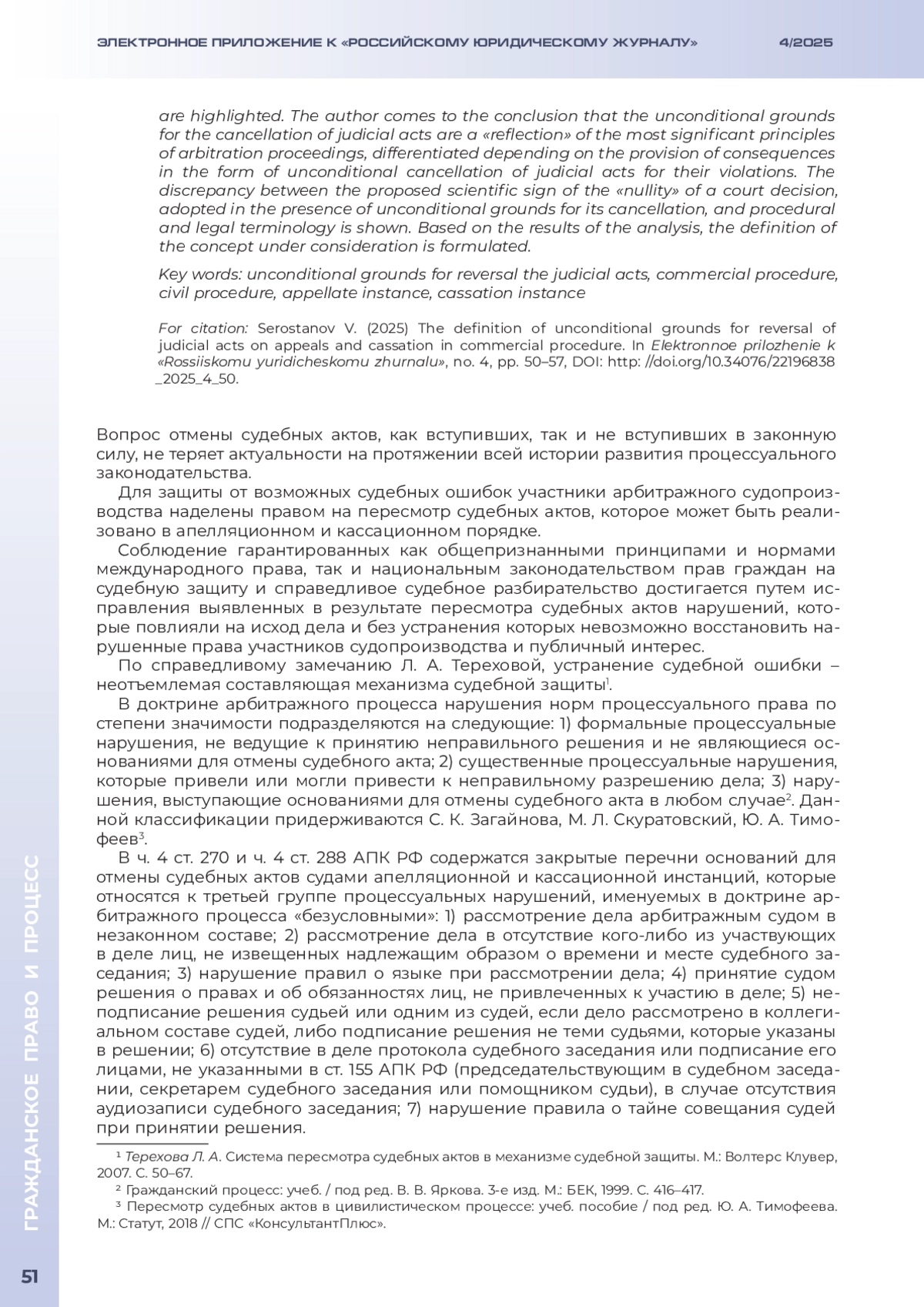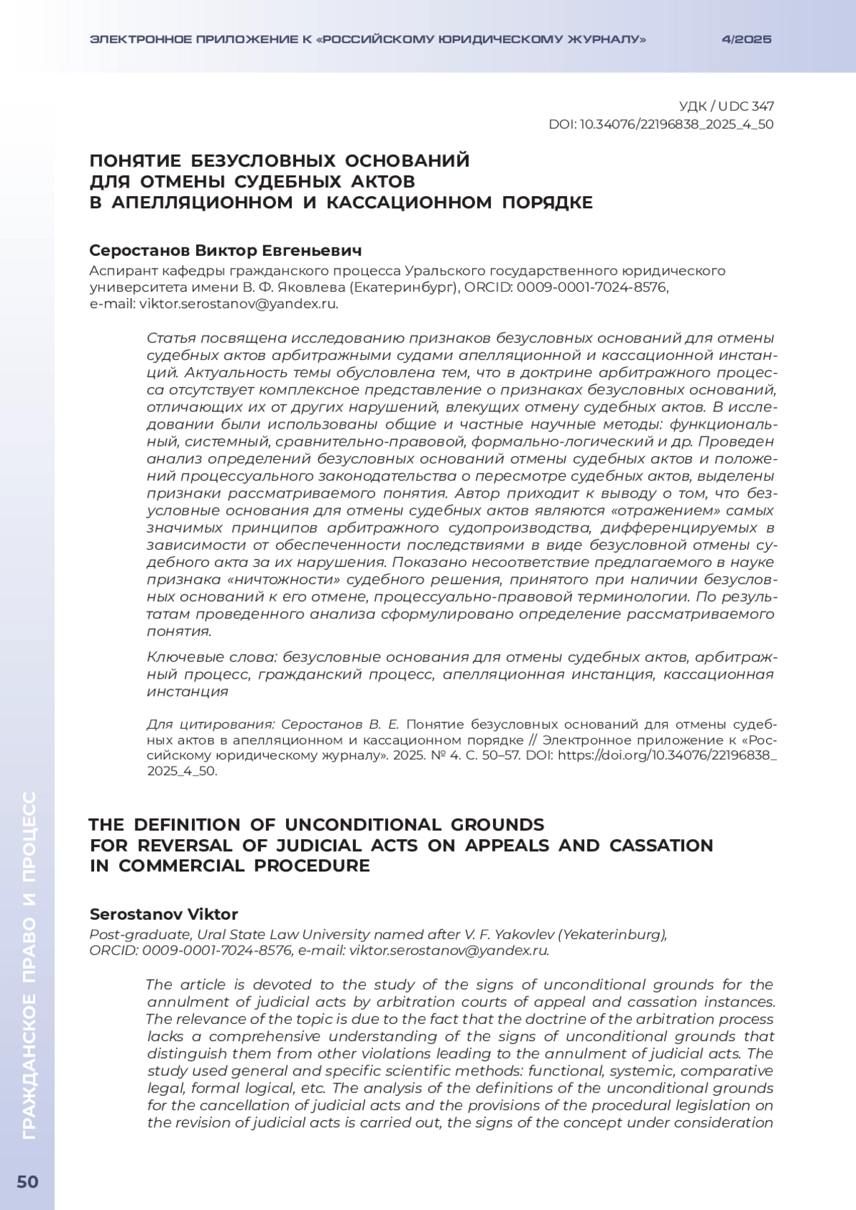 СЕРОСТАНОВ В. Е. ПОНЯТИЕ БЕЗУСЛОВНЫХ ОСНОВАНИЙ ДЛЯ ОТМЕНЫ СУДЕБНЫХ АКТОВ В АПЕЛЛЯЦИОННОМ И КАССАЦИОННОМ ПОРЯДКЕ // ЭЛЕКТРОННОЕ ПРИЛОЖЕНИЕ К РОССИЙСКОМУ ЮРИДИЧЕСКОМУ ЖУРНАЛУ. 2025. № 4