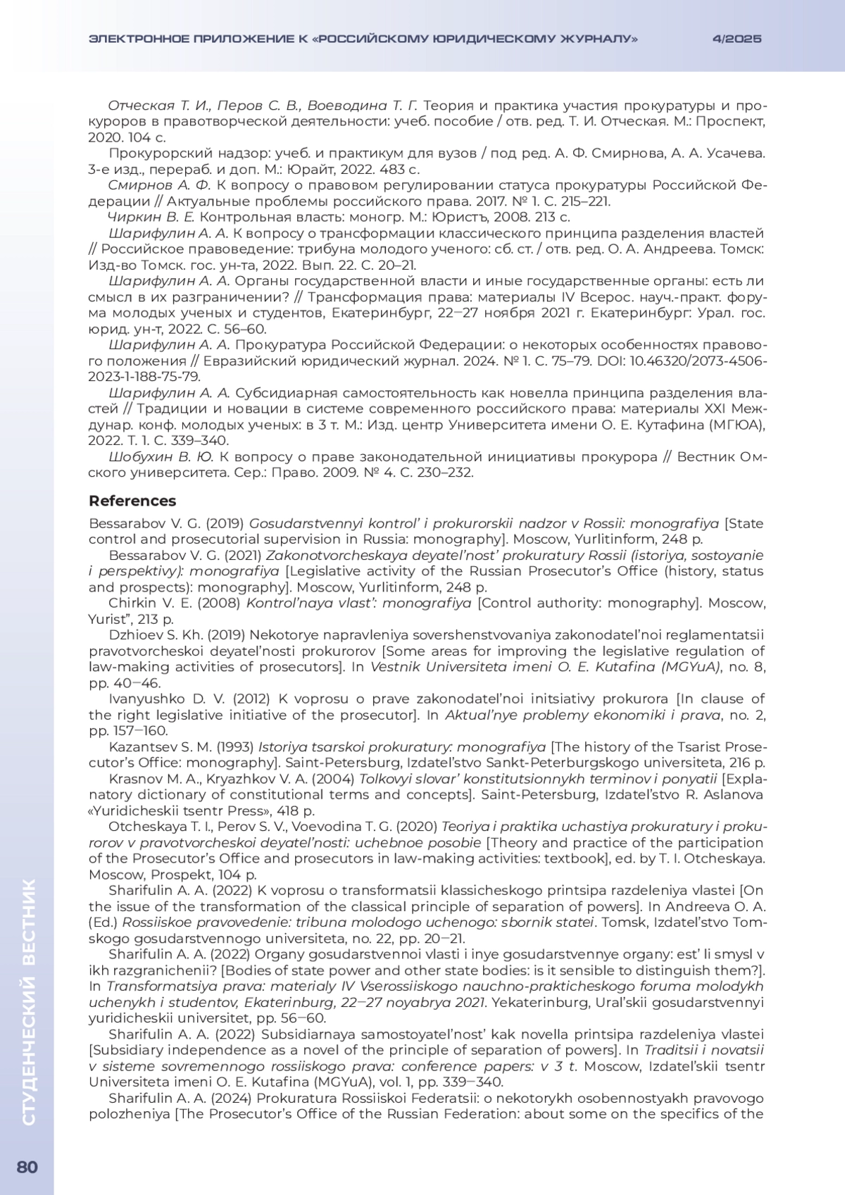 1. Бессарабов В. Г. Государственный контроль и прокурорский надзор в России: моногр. М.: Юрлитинформ, 2019. 248 с. EDN: FMJRVX