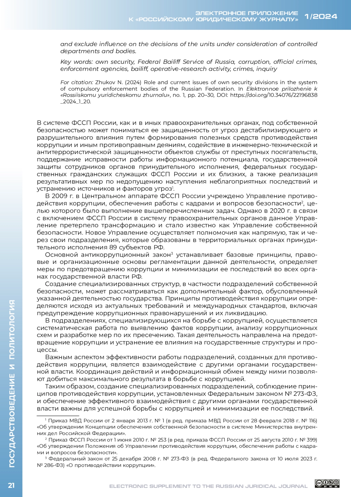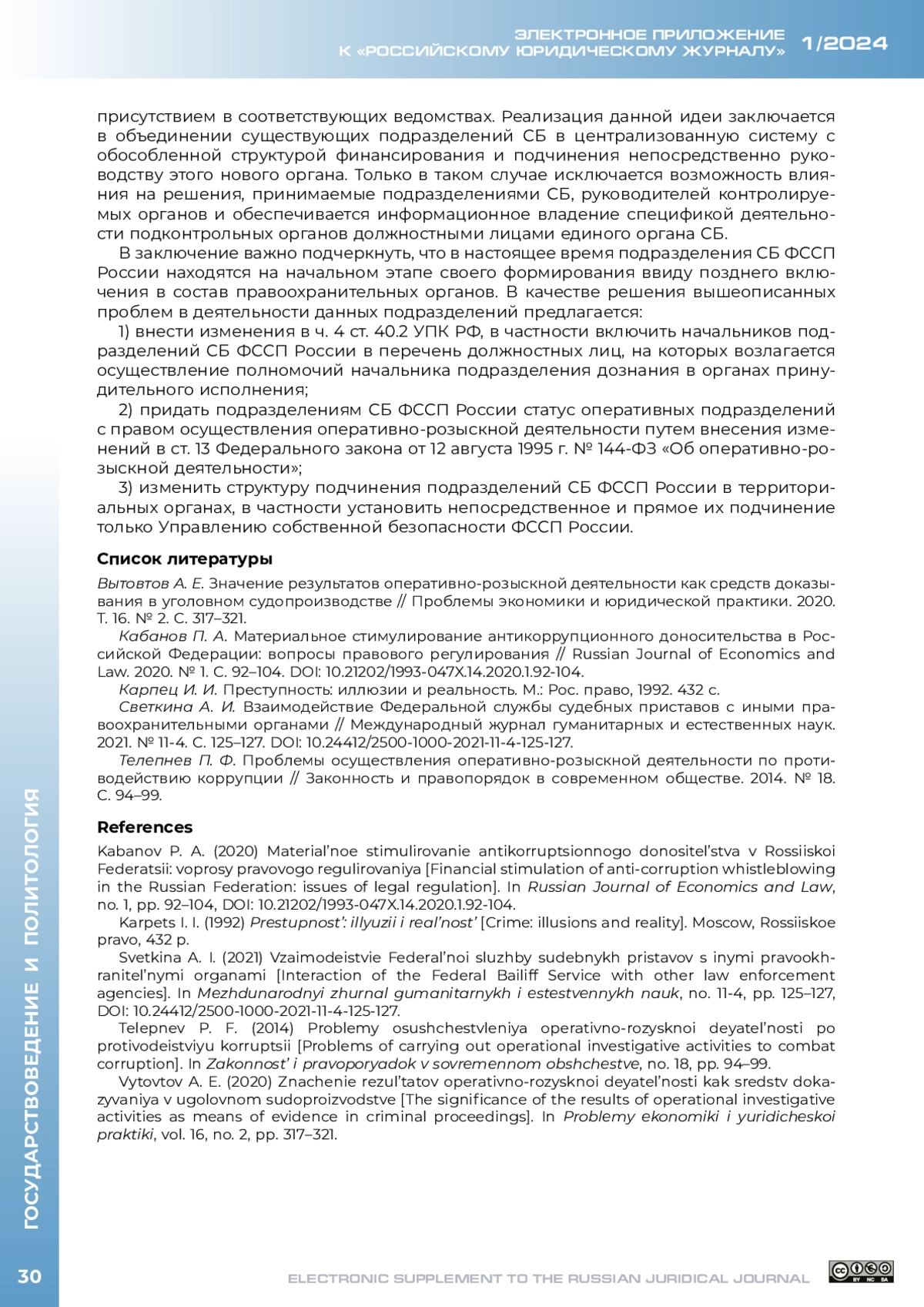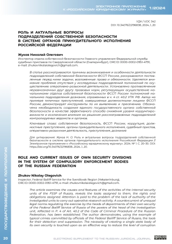 В статье рассматриваются причины возникновения и особенности деятельности подразделений собственной безопасности ФССП России, раскрываются поставленные перед ними задачи, возложенные права и обязанности. Уделяется внимание проблеме отсутствия у исследуемых подразделений полномочий по осуществлению оперативно-розыскной деятельности. Установлено противотечение неравнозначных друг другу правовых норм, регулирующих осуществление начальниками отделов собственной безопасности ФССП России полномочий начальника подразделения дознания, отраженных в ч. 4 ст. 40.2 УПК РФ. Автор на примере типичных преступлений, совершаемых должностными лицами ФССП России, демонстрирует инструменты по их выявлению и пресечению. Обозначена необходимость создания единого государственного органа собственной безопасности в качестве эффективного способа снижения уровня коррумпированности и исключения влияния на решения рассматриваемых подразделений контролируемых ведомств и органов.