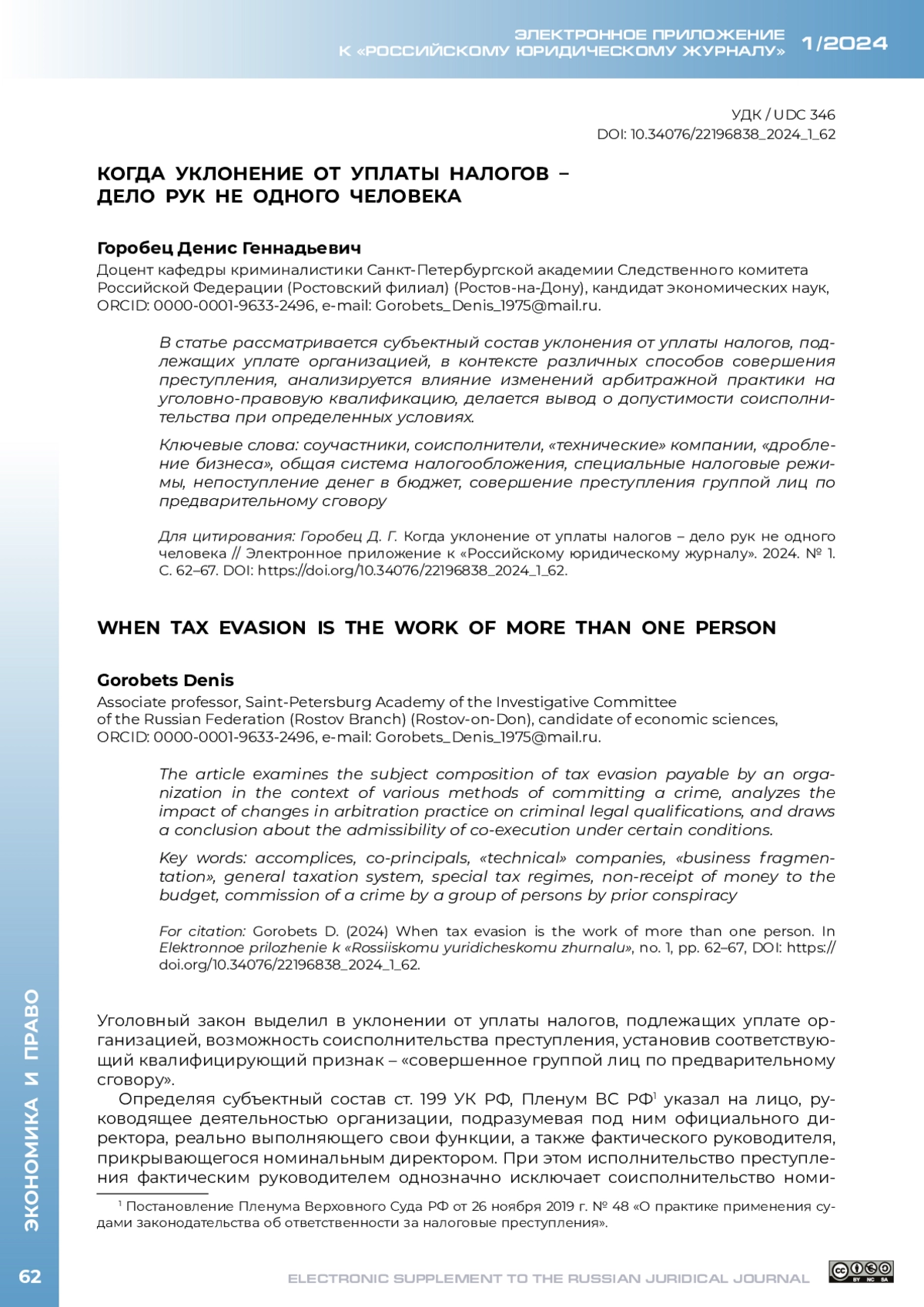 В статье рассматривается субъектный состав уклонения от уплаты налогов, подлежащих уплате организацией, в контексте различных способов совершения преступления, анализируется влияние изменений арбитражной практики на уголовно-правовую квалификацию, делается вывод о допустимости соисполнительства при определенных условиях.