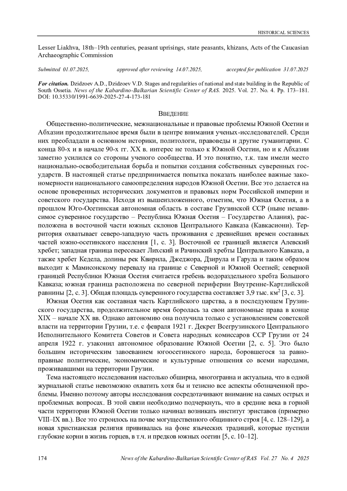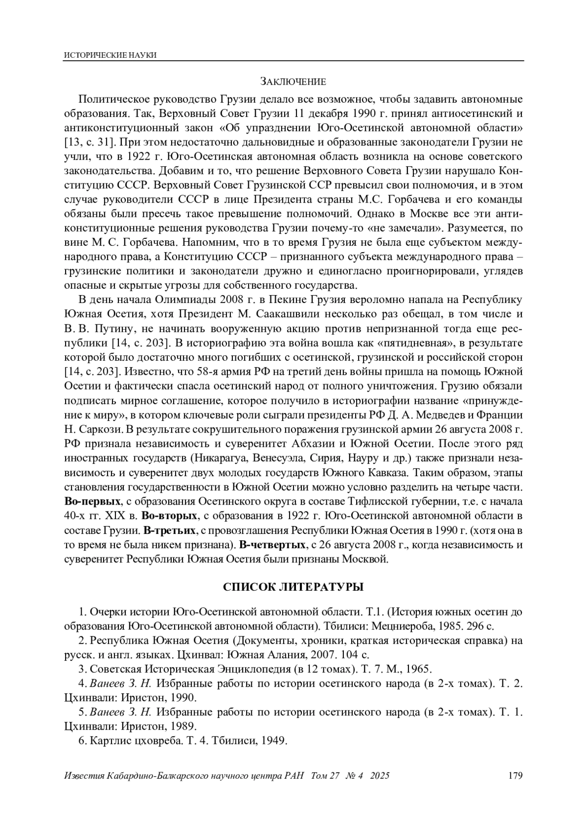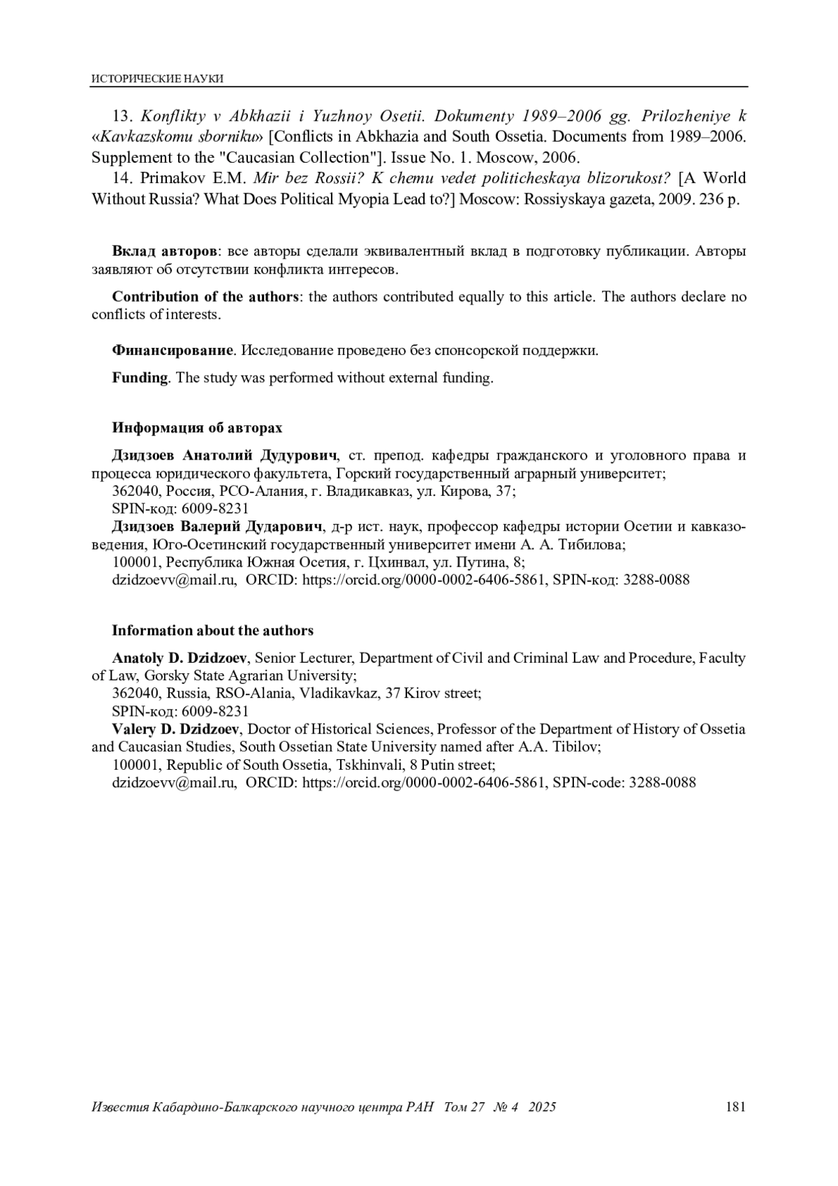 12. Дзидзоев В. Д. Подданство южных осетин феодальной Грузии (постановка вопроса) // XI Международный форум историков-кавказоведов, посвященный столетию принятия Конституции СССР 1924 г.; Народы Кавказа в ХVIII-ХХI вв.: история, политика, культура. Ростов-на-Дону, 2024. EDN: NGLHET