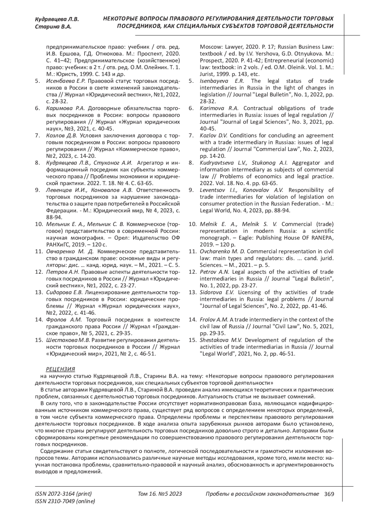 12. Петров А.Н. Правовые аспекты деятельности торговых посредников в России // Журнал “Юридический вестник”, №1, 2022, с. 23-27.