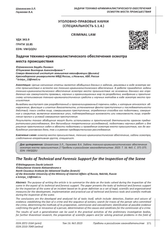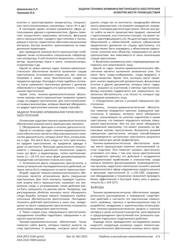 Целью написания статьи является обобщение данных о задачах, решаемых в ходе осмотра места происшествия в аспекте его технико-криминалистического обеспечения. В работе приводятся задачи технико-криминалистического обеспечения осмотра места происшествия на основании данного его определения как совокупности правовых, научных и организационных мер по разработке, внедрению и практическому использованию технико-криминалистических средств и научных методов в ходе осмотра места происшествия. Выводами выступает сам разработанный и проанализированный перечень задач, к которым относятся: обнаружение, фиксация и изъятие доказательств; установление факта преступления и последовательности действий; поиск следов лица, совершившего преступление, определение способов его подготовки, совершения и сокрытия; выявление возможных улик, подтверждающих виновность или невиновность лица; определение причин и условий совершения преступления. Результаты такого обобщения могут быть использованы в практической деятельности органов предварительного расследования, для дальнейших теоретических исследований, подготовки научных работ и для решения практических задач в области подготовки и проведения осмотра места происшествия, как до возбуждения уголовного дела, так и в рамках предварительного расследования.