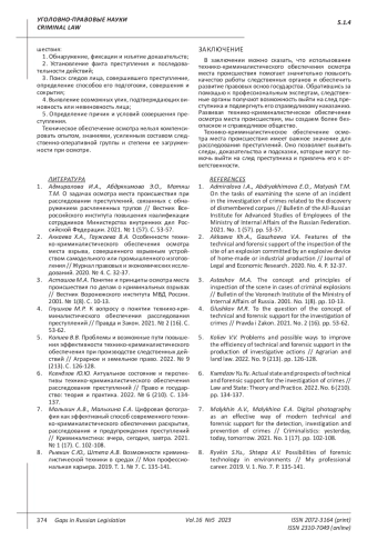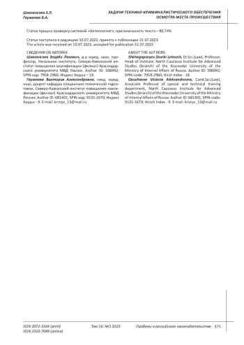 2. Аккаева Х.А., Гаужаева В.А. Особенности технико-криминалистического обеспечения осмотра места взрыва, совершенного взрывным устройством самодельного или промышленного изготовления // Журнал правовых и экономических исследований. 2020. № 4. С. 32-37. EDN: OZZZSH