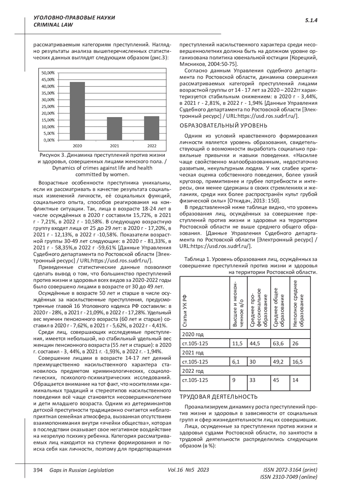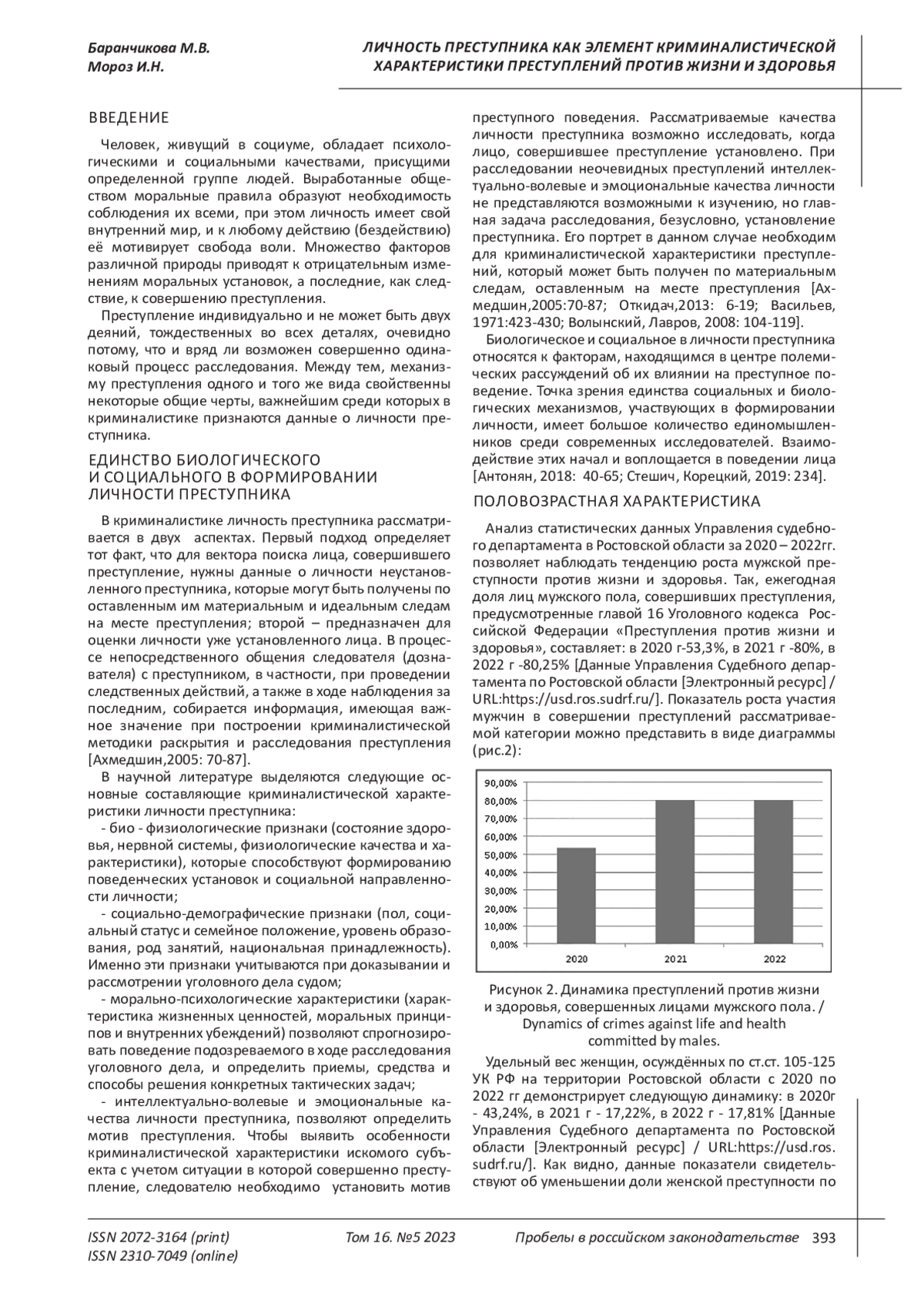 Цель исследования. Личностные качества и их связь интересуют криминалиста с тем, чтобы выяснить, какие именно «сдвиги» и «деформации» характерны для контингента преступников. Выявленные на репрезентативном статистическом материале данные о личности виновного могут стать значимым доказательством их причинной связи с механизмом следообразования. Цель исследования, таким образом, заключается в анализе наиболее важных элементов личности преступника, посягающего на жизнь и здоровье, знание о типовых качествах которого необходимы в процессе построения методики расследования преступлений соответствующей группы. Выводы. На основе анализа статистических данных о преступлениях против жизни и здоровья предложен типовой социально-демографический портрет виновного лица, определяющий направление дальнейшего совершенствования тактико-криминалистических рекомендаций и содержание алгоритма расследования преступлений данной категории. В этом находит предметное подтверждение комплексный характер вопроса изучения личности преступника, решение которых достигается путем интегрирования в криминалистику многих наук, в частности криминологии, социологии и психологии.