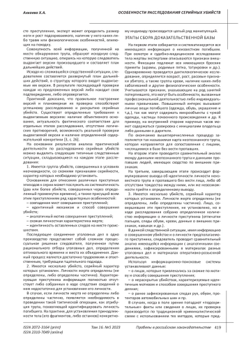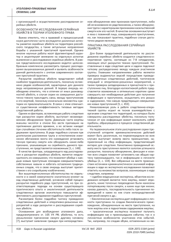 3. Баталина В.И., Гаврилова Д.Ф. Проблемы методики расследования серийных убийств // Международный журнал гуманитарных и естественных наук. 2022. № 12-1 (75). С. 25-28. EDN: PEULGB