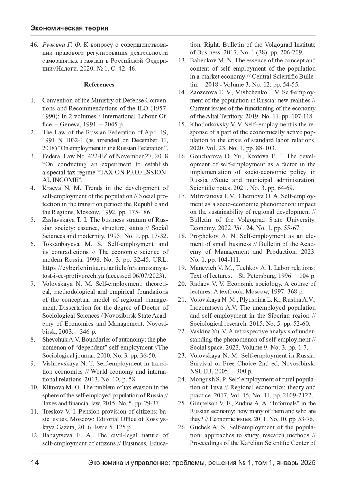 ВОЛОВСКАЯ Н. М. ТРАКТОВКИ САМОЗАНЯТОСТИ В ТРУДАХ ОТЕЧЕСТВЕННЫХ УЧЕНЫХ И ЕЕ ЗАКОНОДАТЕЛЬНОЕ РЕГУЛИРОВАНИЕ // ЭКОНОМИКА И УПРАВЛЕНИЕ: ПРОБЛЕМЫ, РЕШЕНИЯ. 2025. ТОМ 1 № 1
