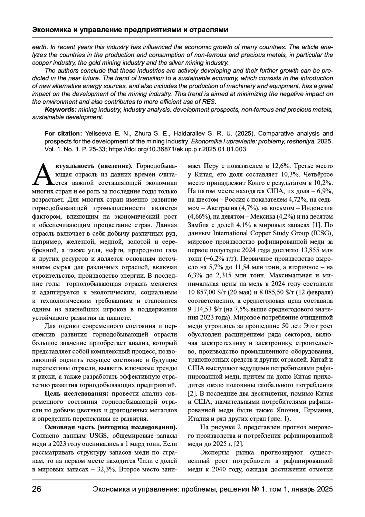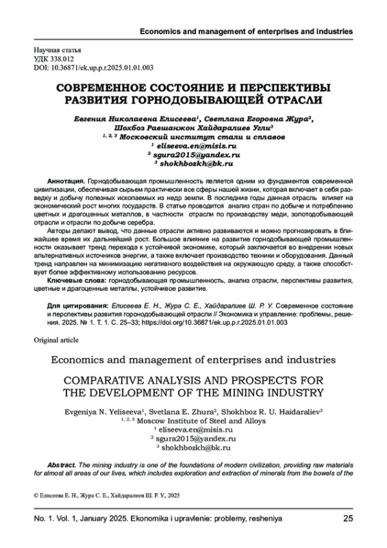 Горнодобывающая промышленность является одним из фундаментов современной цивилизации, обеспечивая сырьем практически все сферы нашей жизни, которая включает в себя разведку и добычу полезных ископаемых из недр земли. В последние годы данная отрасль влияет на экономический рост многих государств. В статье проводится анализ стран по добыче и потреблению цветных и драгоценных металлов, в частности отрасли по производству меди, золотодобывающей отрасли и отрасли по добыче серебра. Авторы делают вывод, что данные отрасли активно развиваются и можно прогнозировать в ближайшее время их дальнейший рост. Большое влияние на развитие горнодобывающей промышленности оказывает тренд перехода к устойчивой экономике, который заключается во внедрении новых альтернативных источников энергии, а также включает производство техники и оборудования. Данный тренд направлен на минимизацию негативного воздействия на окружающую среду, а также способствует более эффективному использованию ресурсов.