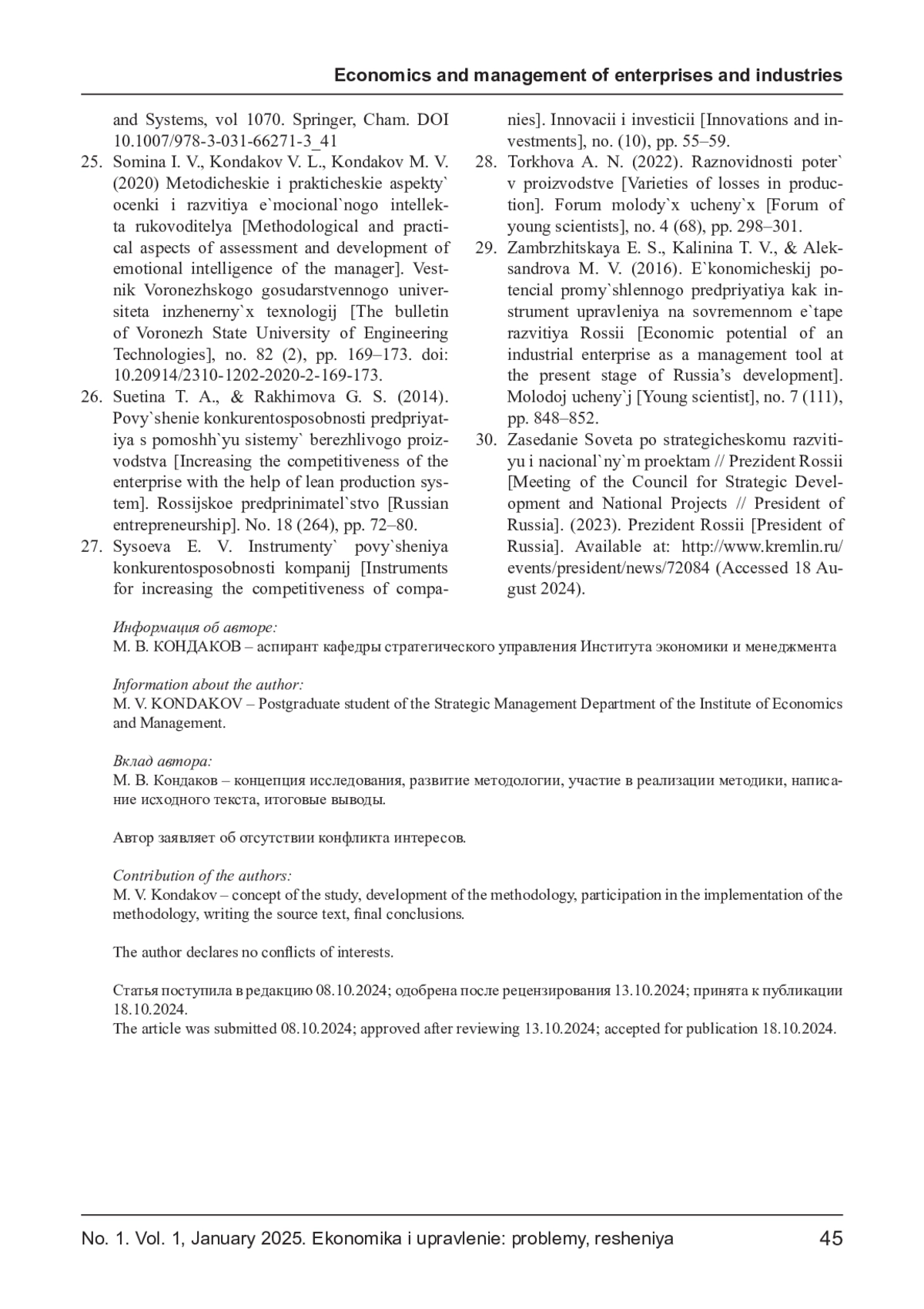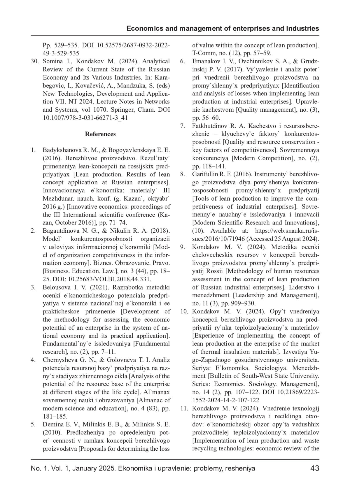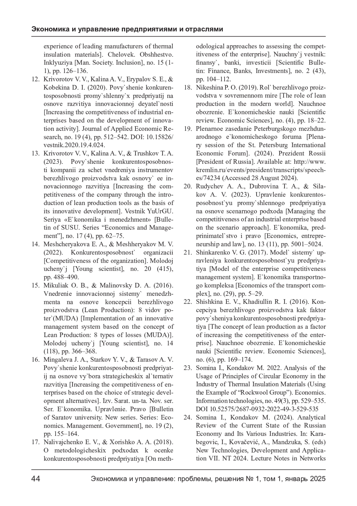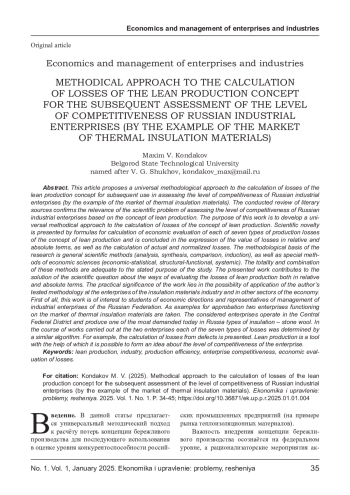 КОНДАКОВ М. В. МЕТОДИЧЕСКИЙ ПОДХОД К РАСЧЁТУ ПОТЕРЬ КОНЦЕПЦИИ БЕРЕЖЛИВОГО ПРОИЗВОДСТВА ДЛЯ ПОСЛЕДУЮЩЕЙ ОЦЕНКИ УРОВНЯ КОНКУРЕНТОСПОСОБНОСТИ РОССИЙСКИХ ПРОМЫШЛЕННЫХ ПРЕДПРИЯТИЙ (НА ПРИМЕРЕ РЫНКА ТЕПЛОИЗОЛЯЦИОННЫХ МАТЕРИАЛОВ) // ЭКОНОМИКА И УПРАВЛЕНИЕ: ПРОБЛЕМЫ, РЕШЕНИЯ. 2025. ТОМ 1 № 1
