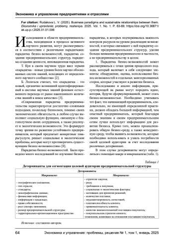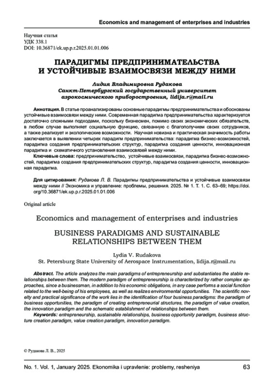 В статье проанализированы основные парадигмы предпринимательства и обоснованы устойчивые взаимосвязи между ними. Современная парадигма предпринимательства характеризуется достаточно сложными подходами, поскольку бизнесмен, помимо своих экономических обязательств, в любом случае выполняет социальную функцию, связанную с благополучием своих сотрудников, а также реализует и экологические возможности. Научная новизна и практическая значимость работы заключается в выявлении четырех парадигм предпринимательства: парадигма бизнес-возможностей, парадигма создания предпринимательских структур, парадигма создания ценности, инновационная парадигма и схематичного установления взаимосвязей между ними.