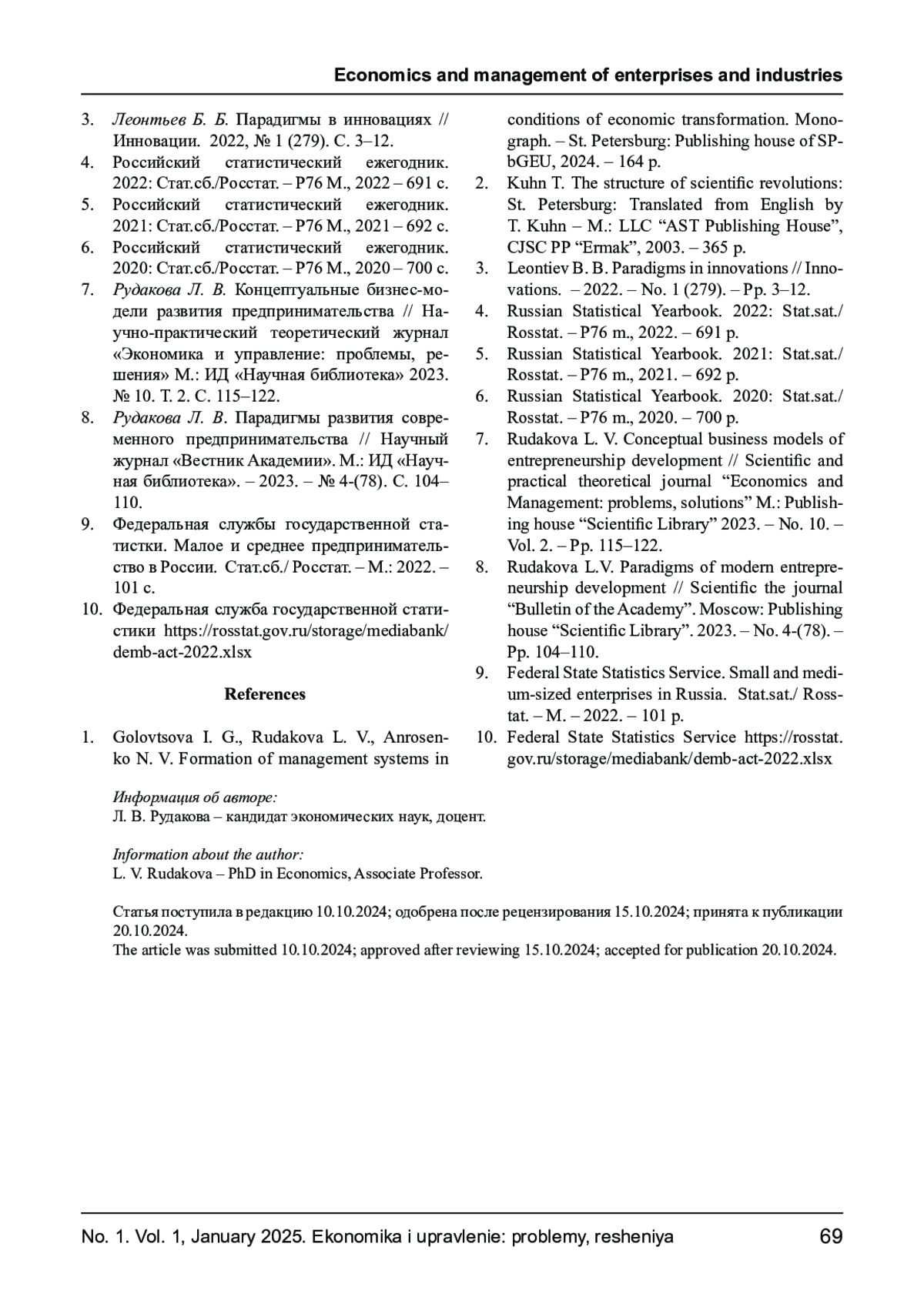 7. Рудакова Л. В. Концептуальные бизнес-модели развития предпринимательства // Научно-практический теоретический журнал “Экономика и управление: проблемы, решения” М.: ИД “Научная библиотека” 2023. № 10. Т. 2. С. 115-122.