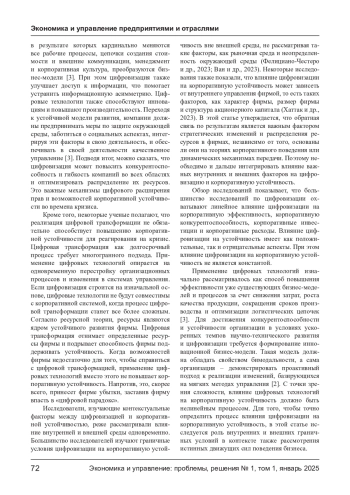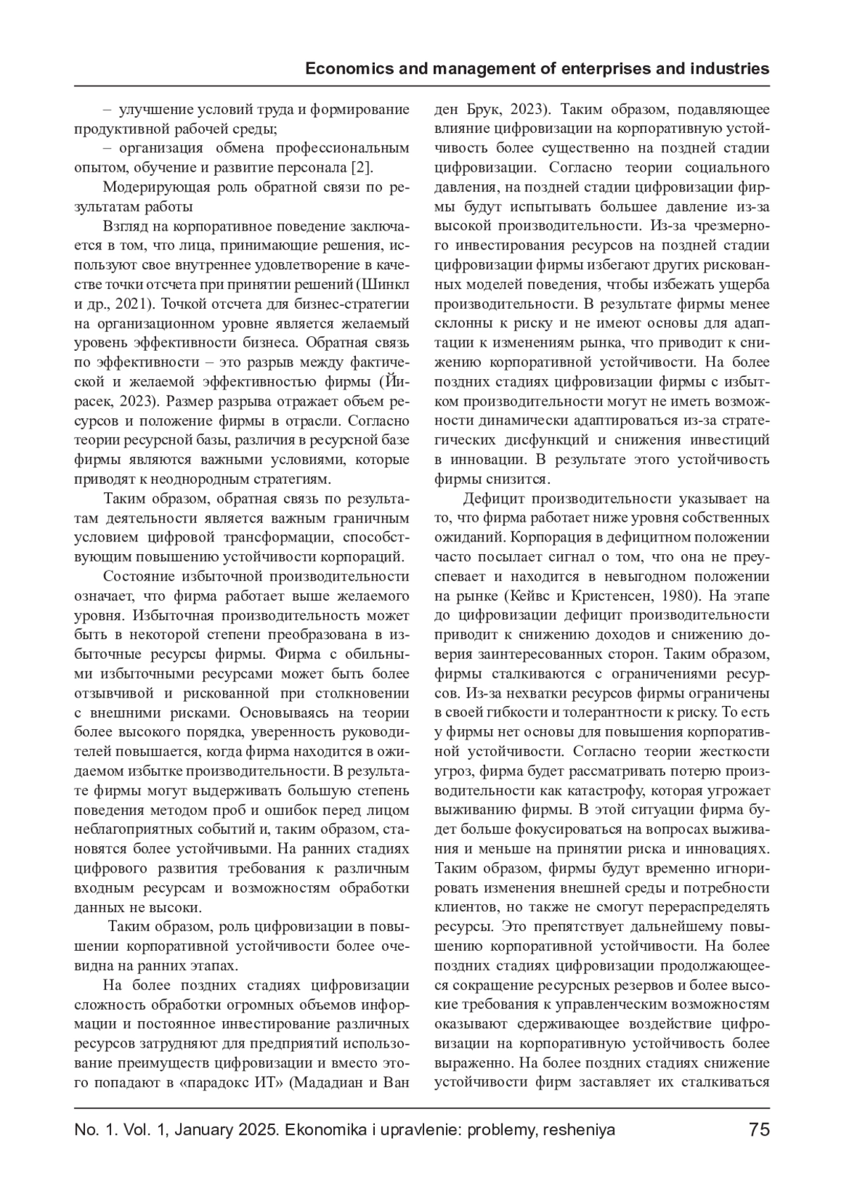 Цель этой статьи - рассмотреть связь между цифровыми технологиями и корпоративной устойчивостью в условиях кризиса, а также механизм действия внутренних и внешних ситуативных факторов на цифровую трансформацию и корпоративную устойчивость. В статье также рассмотрены важные граничные условия с точки зрения внутренней обратной связи по производительности. Проведен анализ взаимосвязи цифровой трансформации и корпоративной устойчивости. Рассмотрено, как цифровизация влияет на устойчивость компаний в кризисных условиях (например, пандемия COVID-19). Исследовано нелинейное влияние цифровых технологий на эффективность и устойчивость организаций. Проанализированы граничные условия цифровизации. Рассмотрено влияние управленческих решений, организационных изменений и корпоративных ресурсов на устойчивость. Предложена гипотеза о перевернутой U-образной связи между цифровой трансформацией и корпоративной устойчивостью. Разработана гипотеза о влиянии избыточной и дефицитной производительности на эту взаимосвязь. Это теоретически дает новое понимание граничных условий цифровизации и корпоративной устойчивости через внутреннюю и внешнюю перспективу. На практике она может помочь фирмам создать позитивную среду на основе обратной связи по результатам деятельности и уровней внешней конкуренции, что в свою очередь может эффективно стимулировать корпоративную устойчивость.