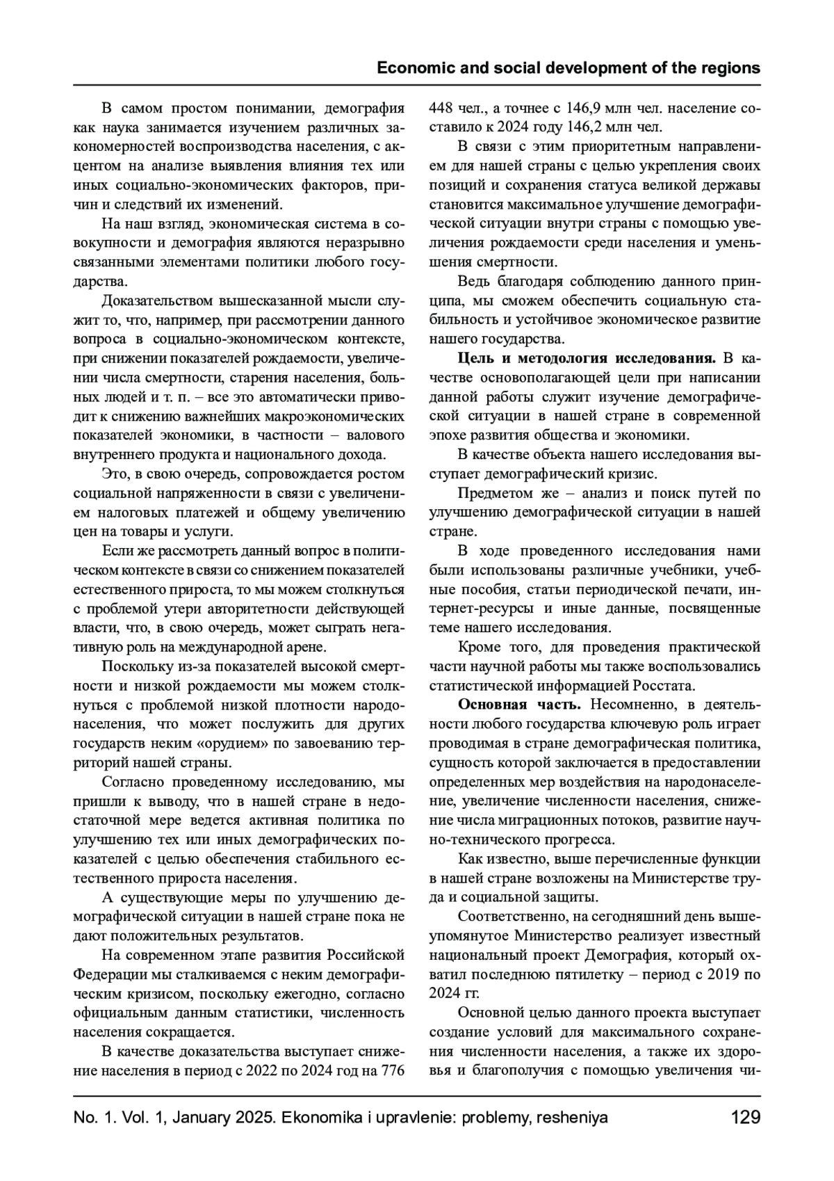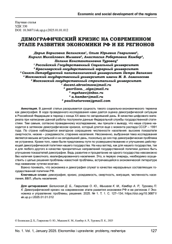 В данной статье раскрывается сущность такого социально-экономического термина как демография. В ходе проведенного исследования нами дается оценка демографической ситуации в Российской Федерации в период с конца ХХ века по сегодняшний день. В качестве цифрового материала при написании данной работы послужили данные Федеральной службы государственной статистики. Тем самым, согласно проведенному исследованию, мы пришли к выводу, что наша страна находится в затяжном демографическом кризисе, который длится еще с момента распада СССР - 1991 года. По стране наблюдается ежегодное сокращение численности населения: высокие показатели смертности, низкие - рождаемости, старение населения. Несомненно, выбранная тема исследования является весьма актуальной и на сегодняшний день, поскольку до сих пор демографическая проблема не устранена. Кроме того, нами были предложены пути по усовершенствованию и улучшению действующей демографической политики нашего государства. На наш взгляд, как для нашего государства, так и для любого другого в качестве приоритетных направлений государственной политики должно быть улучшение показателей демографии. Ведь развитие и процветание не одного государства невозможно без наличия грамотного, квалифицированного населения. Это, в первую очередь, необходимо осуществить с целью решения проблемы известной проблемы, встречающейся в экономической литературе под названием «утечки мозгов». Важно понимать, что экономика и демография служат в качестве неразрывных составляющих государственной политики РФ.