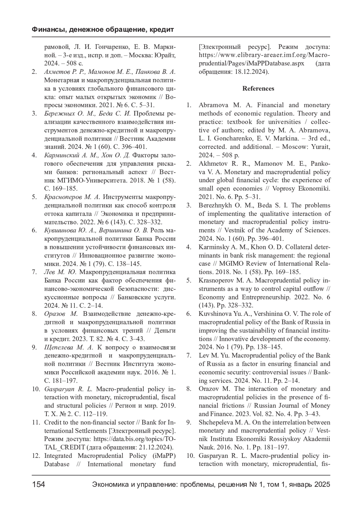 6. Кувшинова Ю. А., Вершинина О. В. Роль макропруденциальной политики Банка России в повышении устойчивости финансовых институтов // Инновационное развитие экономики. 2024. № 1 (79). С. 138-145. EDN: ZKICIN