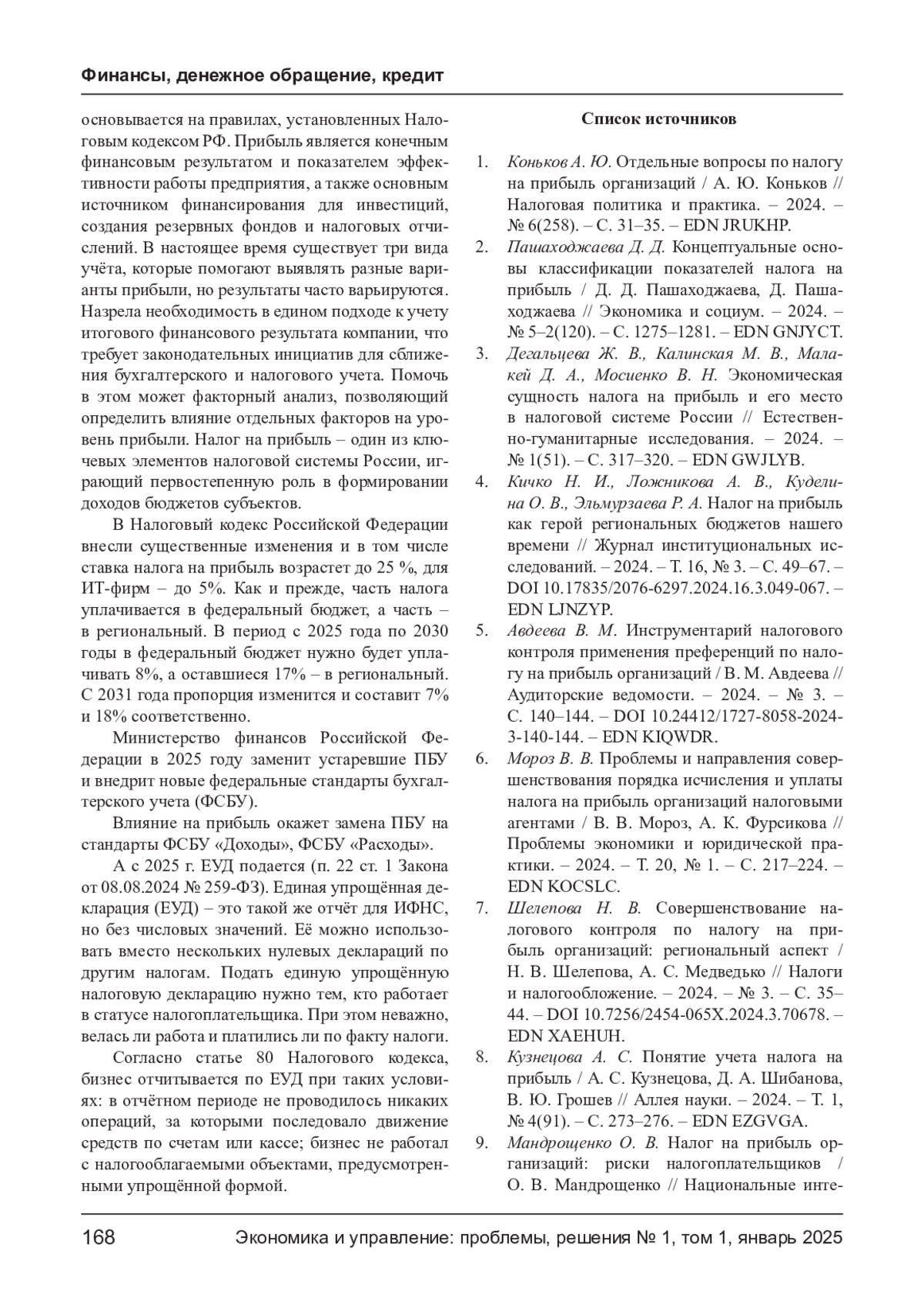 6. Мороз В. В. Проблемы и направления совершенствования порядка исчисления и уплаты налога на прибыль организаций налоговыми агентами / В. В. Мороз, А. К. Фурсикова // Проблемы экономики и юридической практики. - 2024. - Т. 20, № 1. - С. 217-224. EDN: KOCSLC